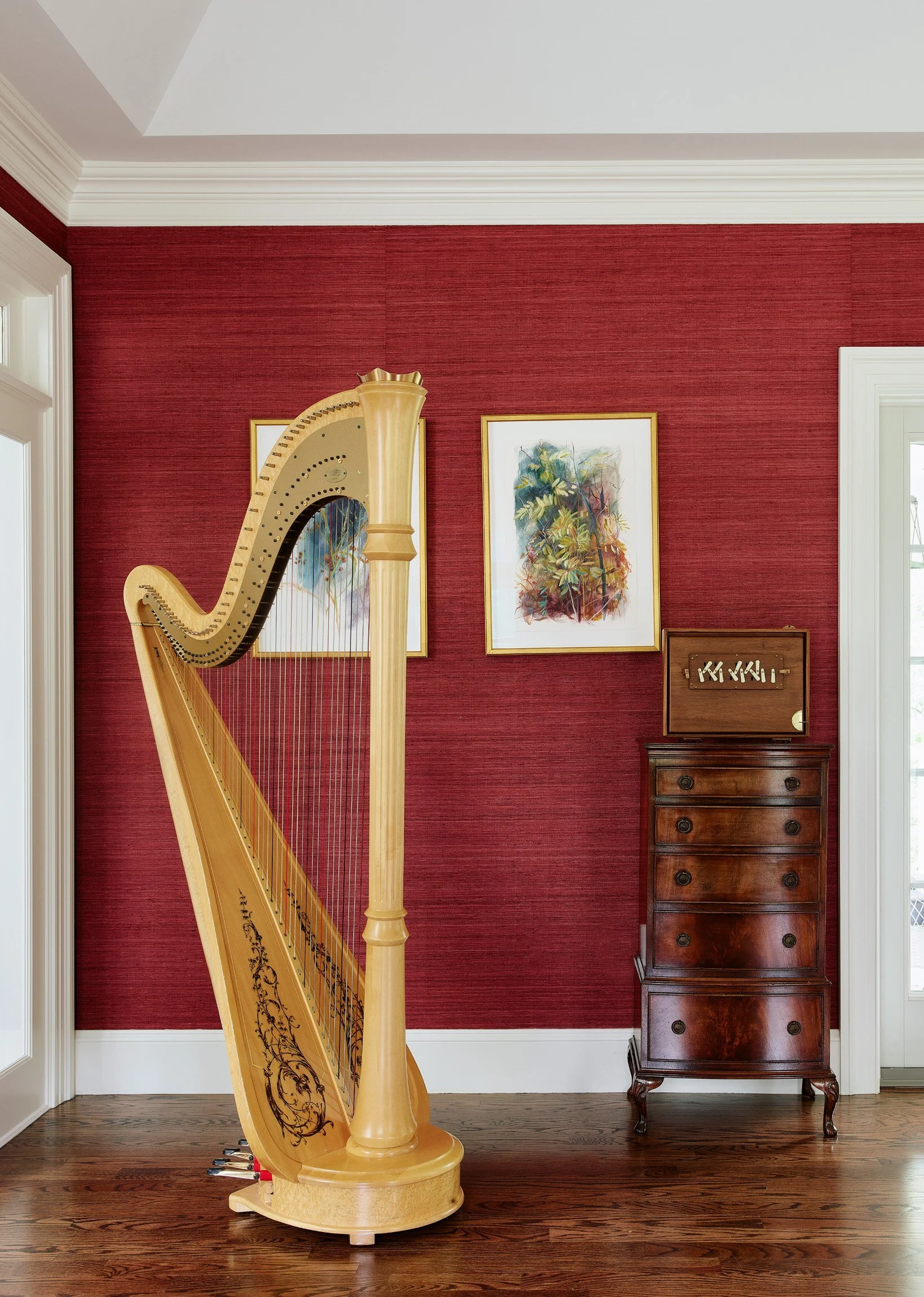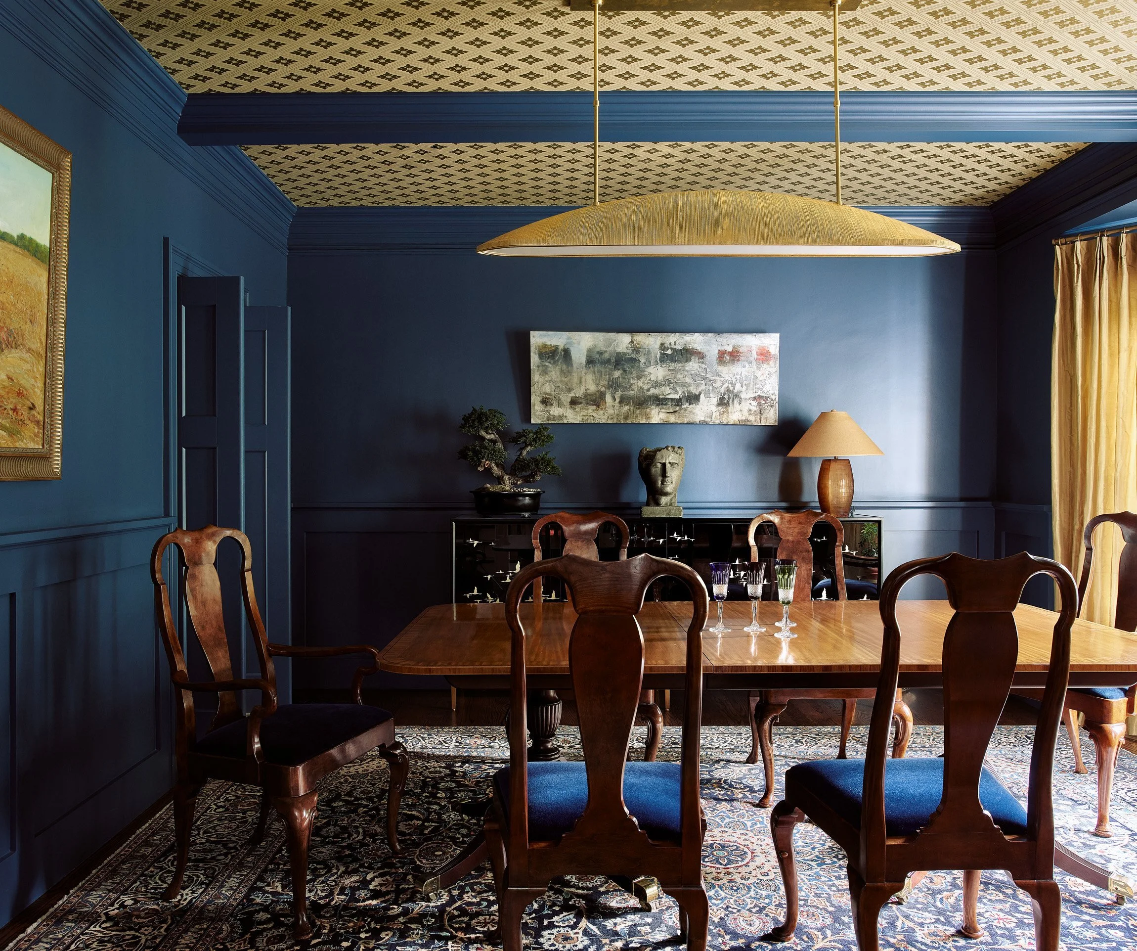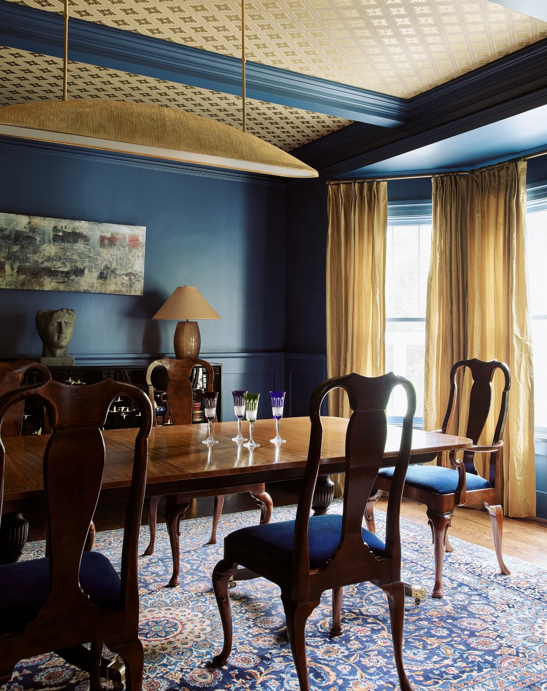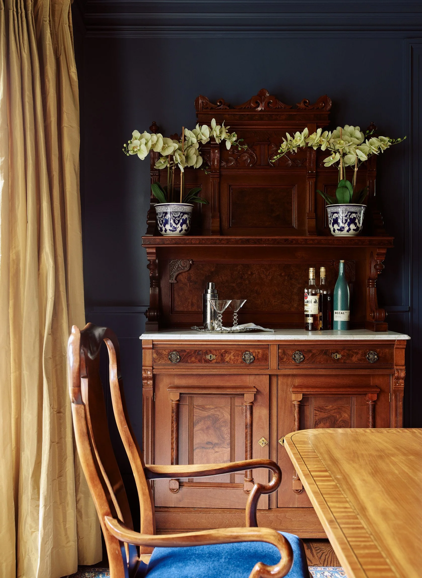 Next to the living room is a music room with a bay window and cherry-colored walls. In its center is a harp, the main instrument of the mistress of the house. The furnishings are complemented by an antique chair and chest of drawers, as well as a vintage modernist sofa. Tynd gave a dark Victorian look to the front dining room of the house: she decorated the walls with blue wood paneling, covered the ceiling with thickly patterned wallpaper and decorated with wooden beams. The atmosphere here is traditional and a little theatrical: in the center there is a chippendale wooden table and chairs, an antique sideboard with carved details against the wall, a classic rural landscape on the wall.