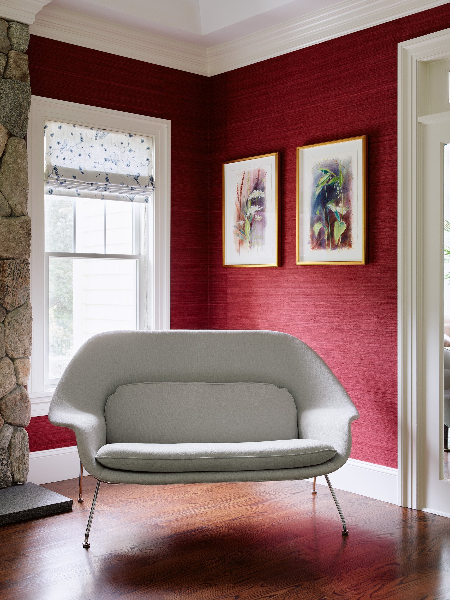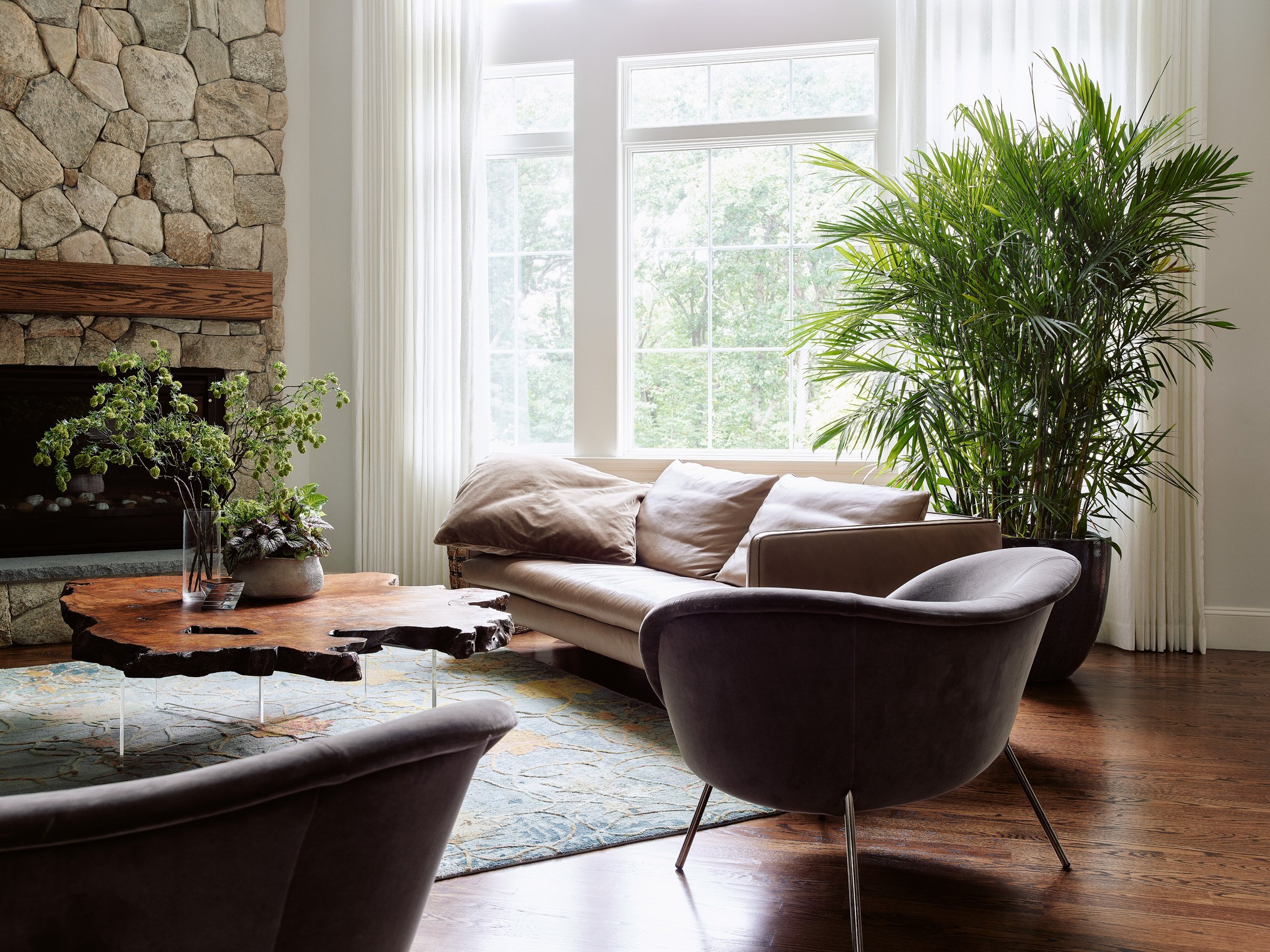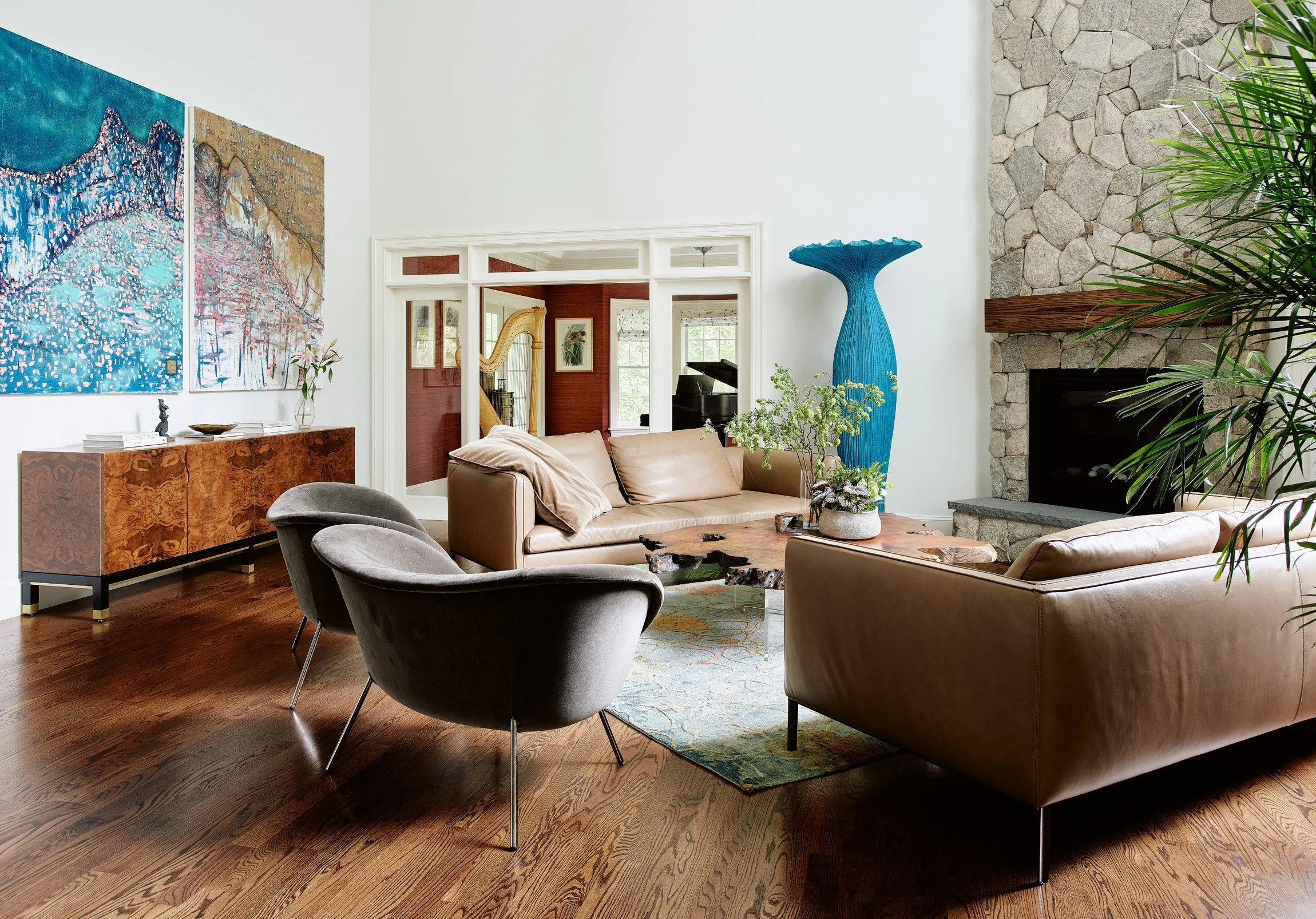 On the ground floor of the house there is a two-height living room with large windows, a rustic fireplace embedded in the corner of the room, and a modernist style dining group. There are white walls and wooden floors, against which stand out the uneven stonework that decorates the fireplace and chimney, and bright paintings on the walls. A sculpted mahogany slab table echoes the low pedestal custom-made for this project. The symmetry of the sofas and armchairs is emphasized by paired canvases by the artist Pierre Frethure. The vintage breakfast table, located by the window in the corner of the living room, is surrounded by iconic chairs designed by Norman Cherner.