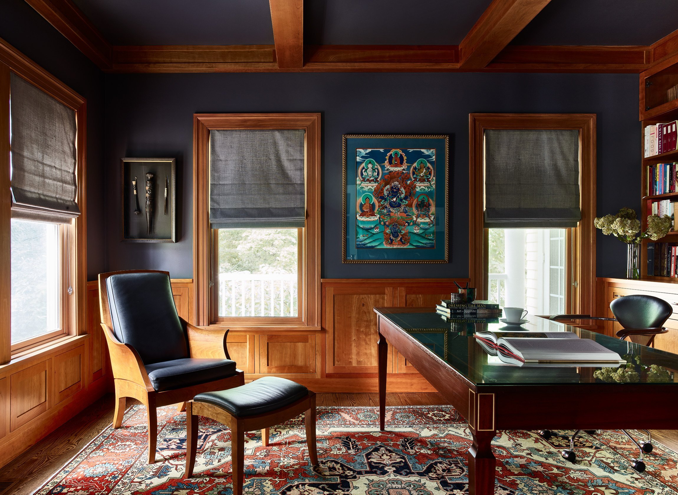 The study and the library look as if letters were written and the accounts of the grandparents of the owners were written here. Honey-colored wall paneling and beams, navy blue walls, vintage carpet and traditional furniture create a cozy and relaxed feel.