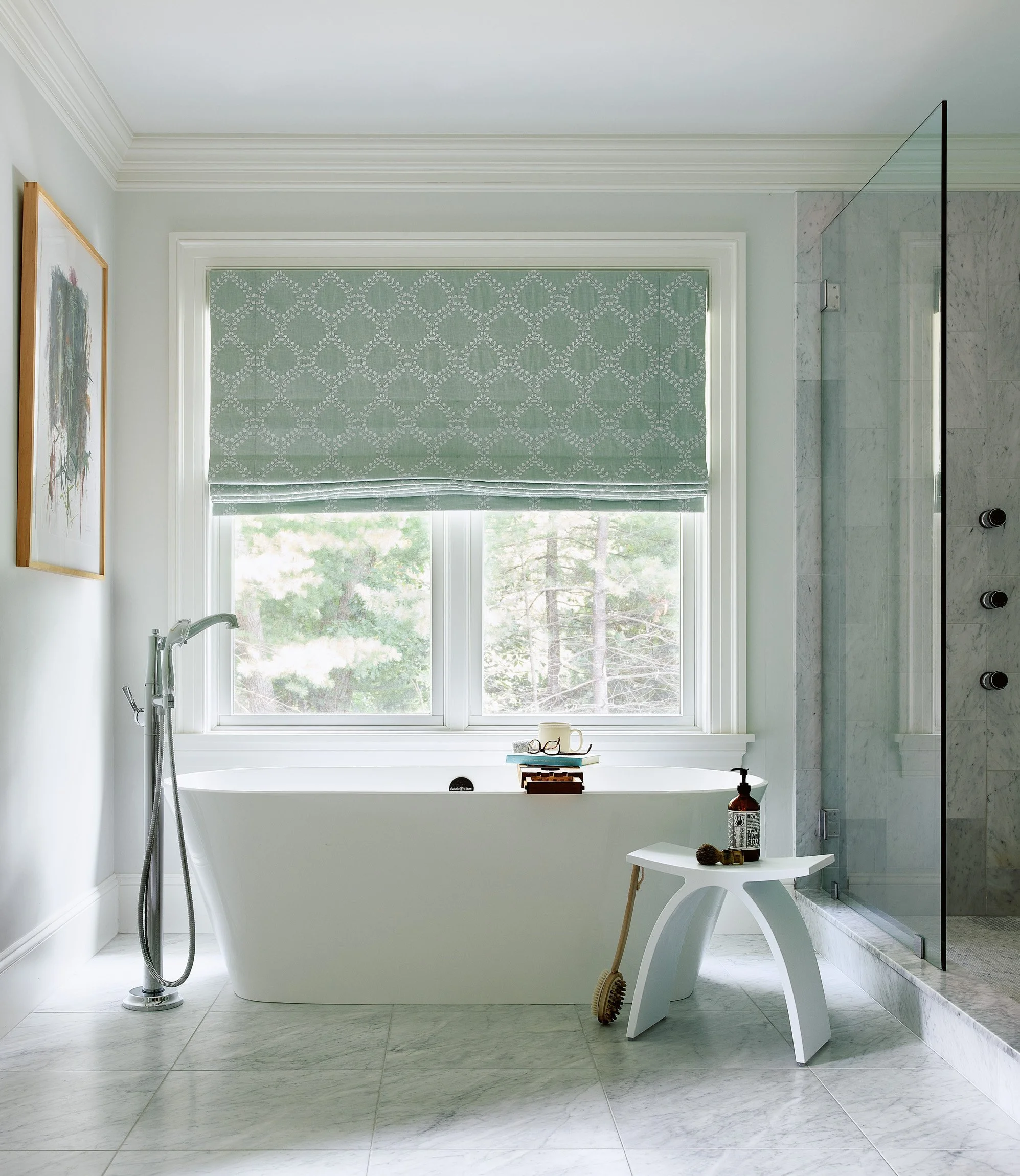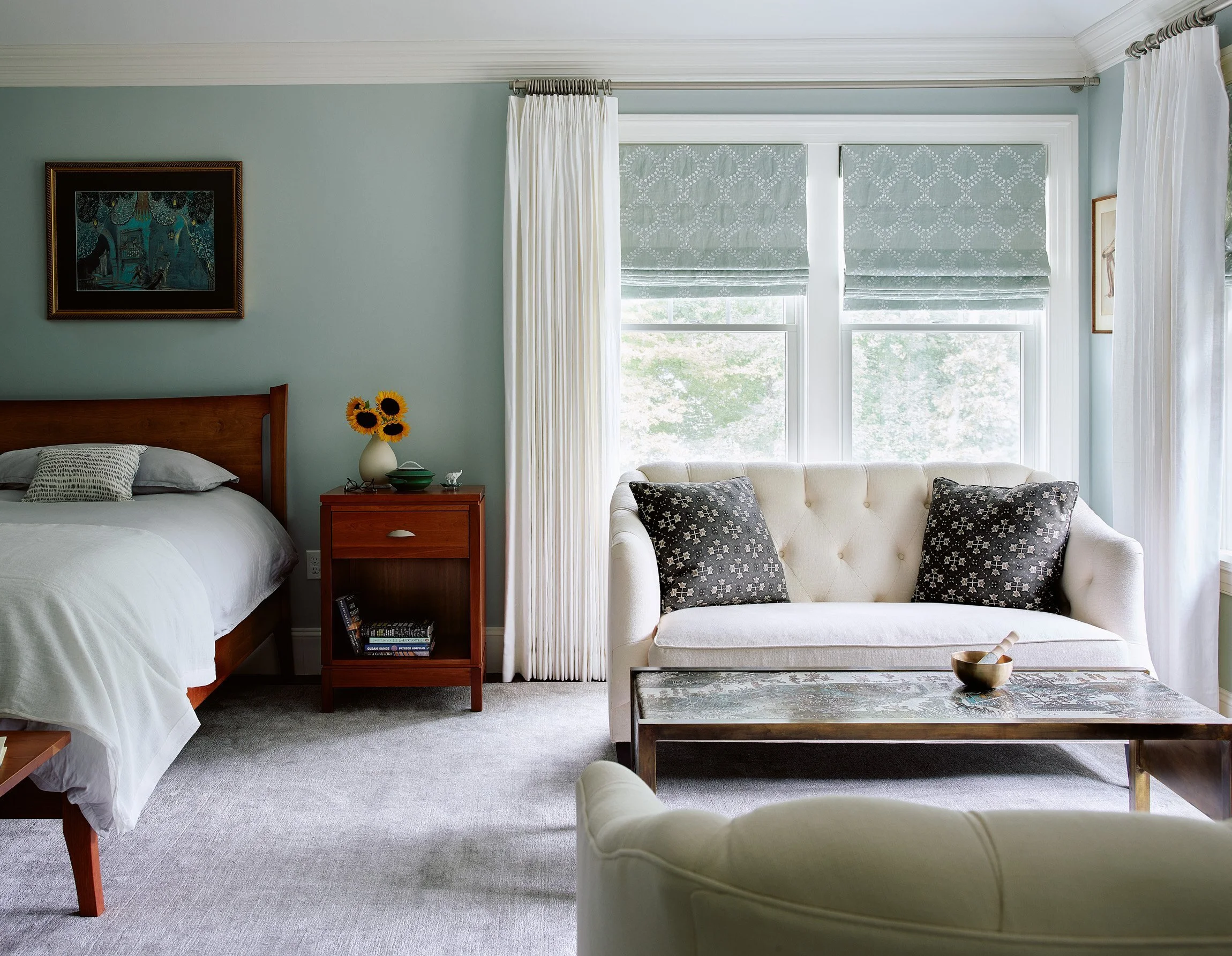 The master bedroom, located on the second floor, is filled with light and air. The palette of the room combines white, light gray and cream tones and a fresh mint shade. The designer used dark wood furniture to bring contrast. Roman shades with delicate patterns, wide cornices, high baseboards and elegant quilted sofas create a classic setting that is well known to every fan of traditional American interiors.