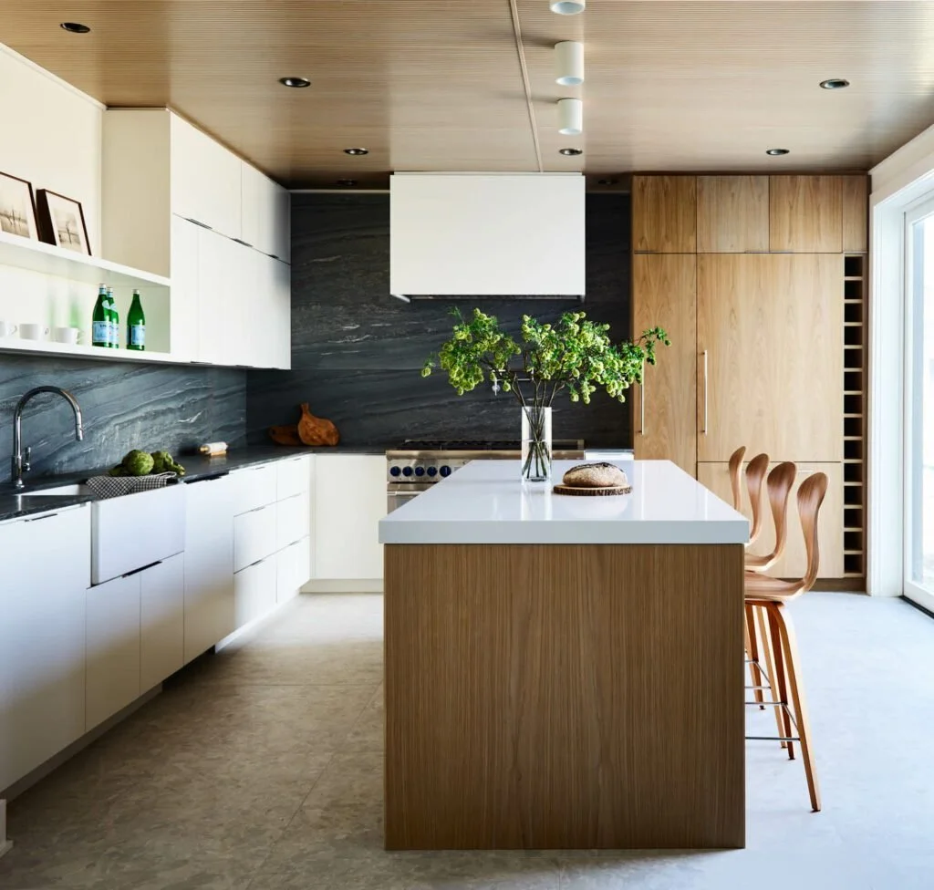 Overlooking Long Island Sound, this contemporary 5,500-square-foot new build by Acorn Deck House features interiors inspired by the surrounding landscape through its color palette of sea foam green, gold and charcoal gray; its organic forms; and its natural materials including white oak wood, schist stone, linen, and wool.
