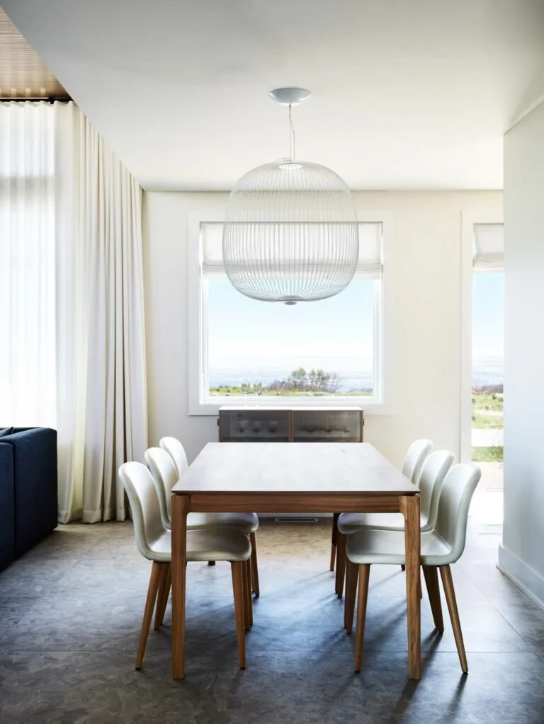 An Ethnicraft table sits below a Foscarini lighting fixture.