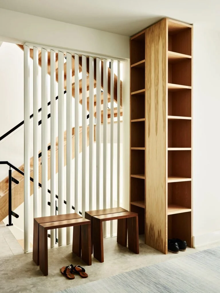 In the office, a custom desk was created to slide into one of the slots of the shelves, allowing the two structures to meet in an elegant way.