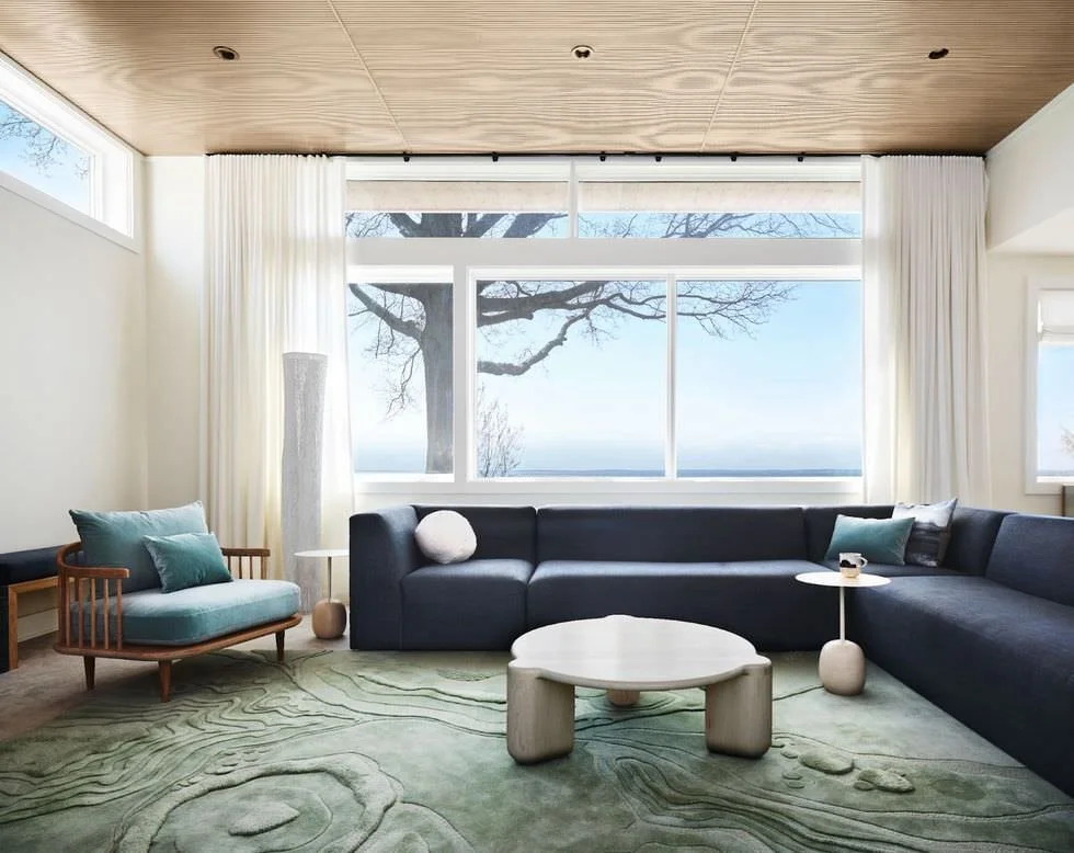 A custom sectional wraps around the living room atop a custom rug by Angela Adams.