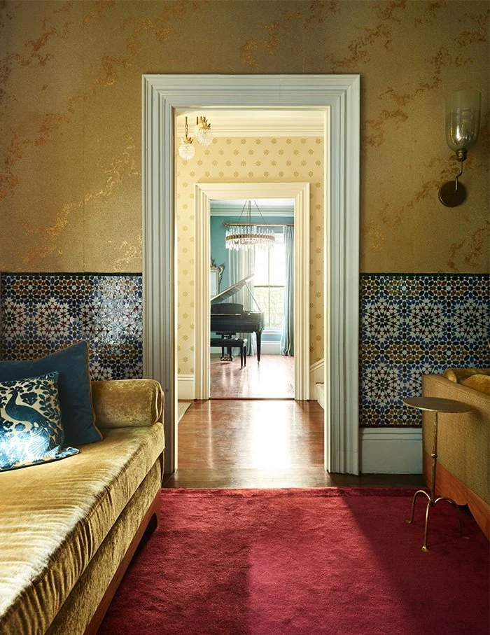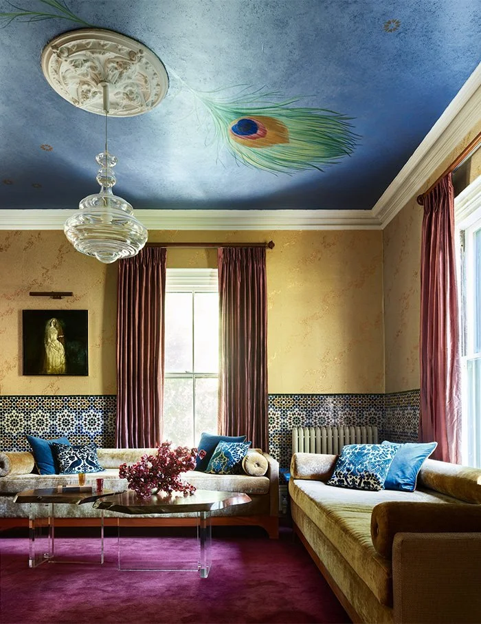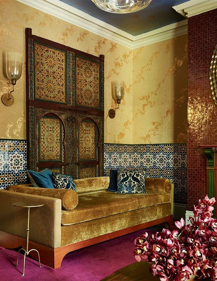 The Moroccan Salon is a sight to behold, with custom-made divan sofas in Romano velvet, a custom-made acrylic and a kintsugi coffee table by Mark Brunke. Schumacher silk drapes, a Maya Romanoff wallpaper, and tiles sourced from Morocco via Marrakech Designs transport one to another time. A stunning ceiling mural by Tasha Cough takes the spotlight; Photograph by Jared Kuzia