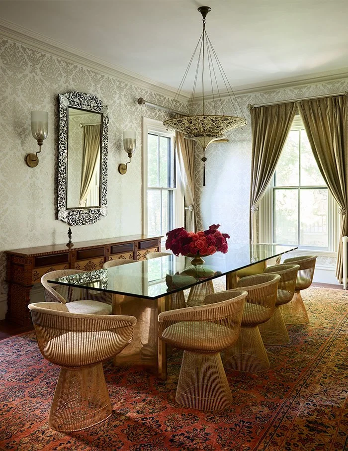 The formal dining room promises a royal dining experience. The dining table is from RH, the chairs are from Platner and the rug is from Nazimyal NY. The wallpaper is from Graham Brown and the drapery is from Pierre Fray; Photograph by Jared Kuzia