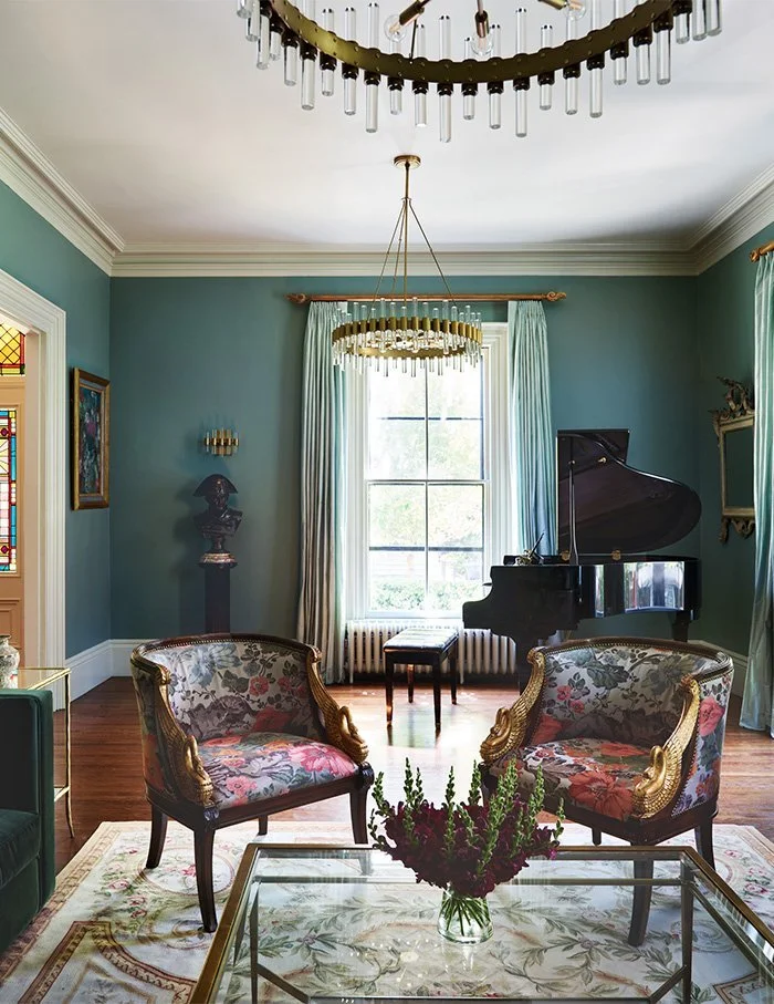 The Napoleonic Salon is graced by a custom-made tuxedo sofa in Romo Velvet, an Aubusoon vintage rug, vintage swan chairs and a coffee table by Worlds Away; Photograph by Jared Kuzia