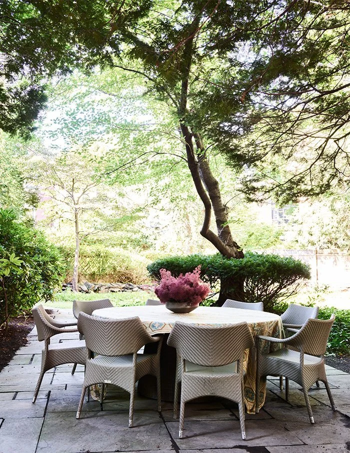 The marble table in a corner of the garden is a space to host outdoor gatherings and is reminiscent of a Sicilian summer; Photograph by Jared Kuzia