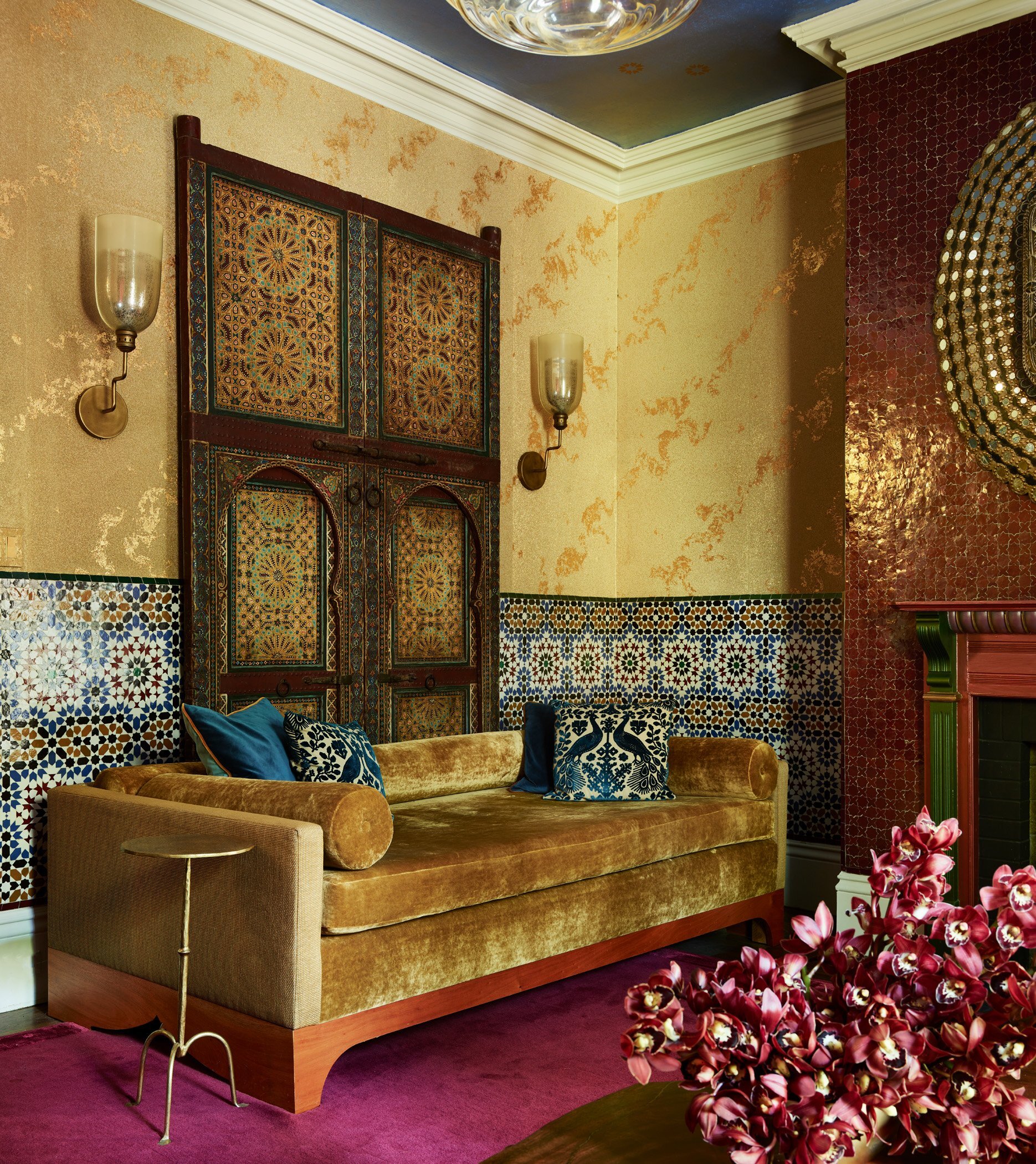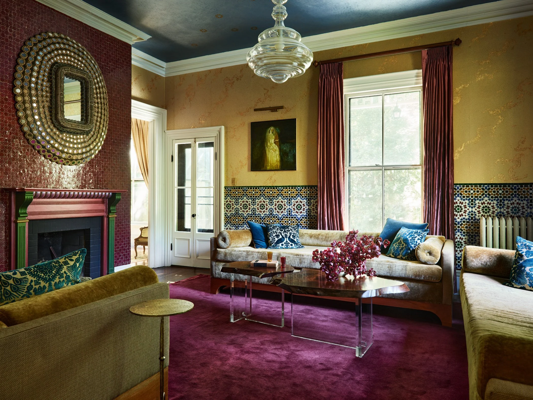 The Salon Marocain with its Neverending Glory pendant, RH Peacock Mirror, Mark Brunke custom coffee table, silk drapery from Designer Draperies in Boston, and Princess in Gold by Indian painter Arup Das.