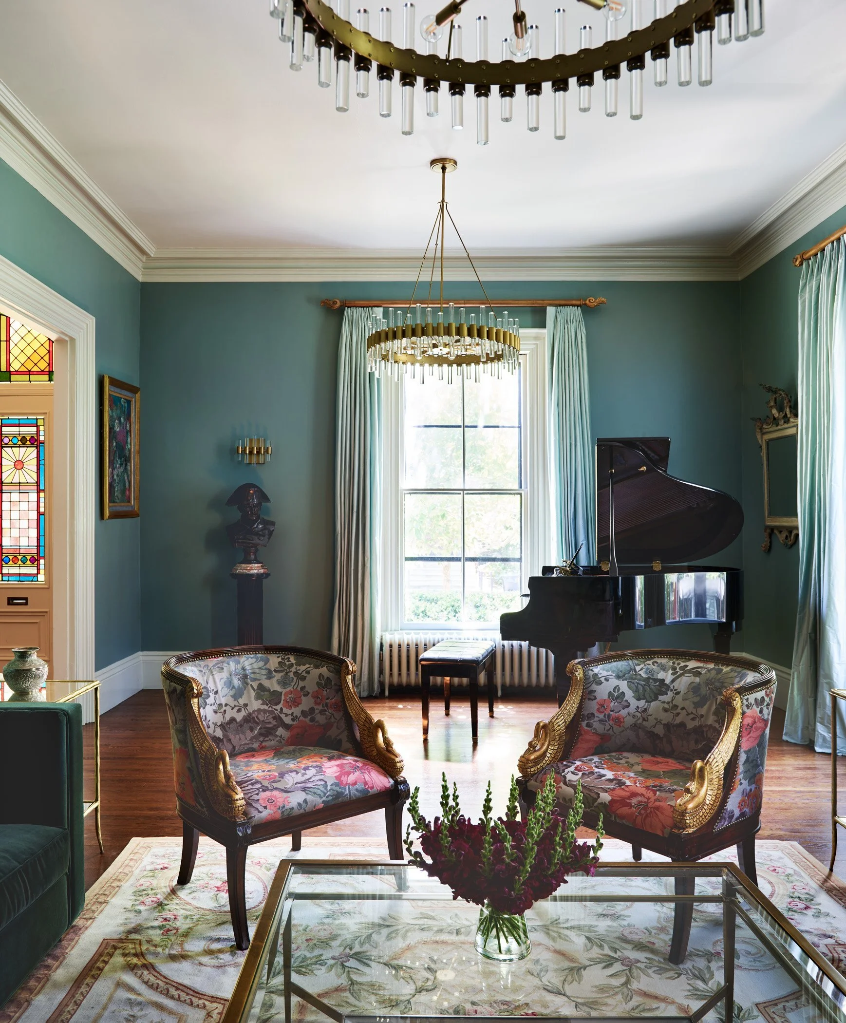 The Salon de Napoléon features antique Josephine Swan chairs and Aubusson rug, Woodbridge coffee table, Arteriors chandelier and sconce, and Napoleon bust from France.