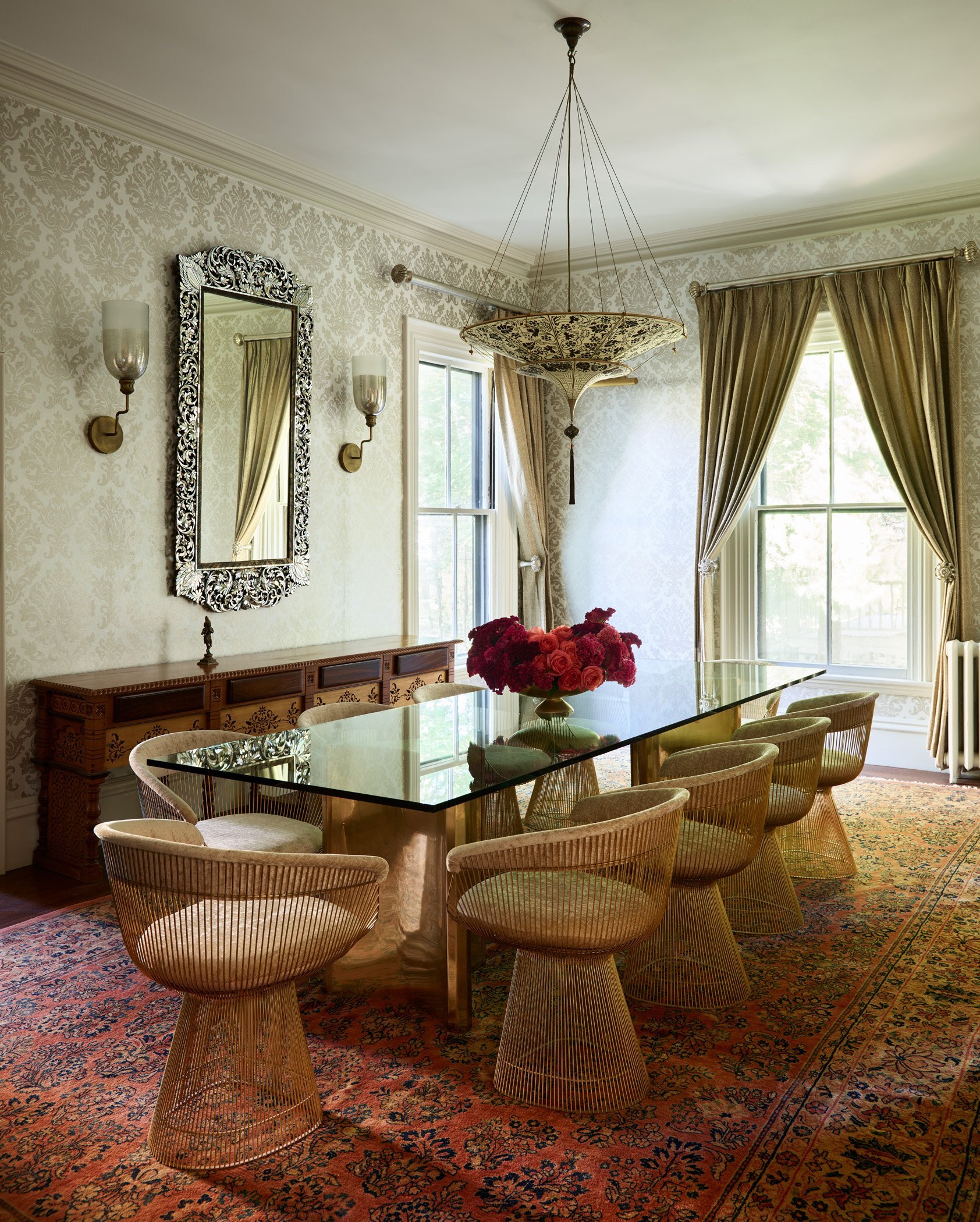 The Persian formal dining room with RH table, Platner chairs, Nazmiyal antique rug, Fortuny pendant, Arteriors sconces, Chairish mirror, vintage buffet, Pierre Frey draperies.