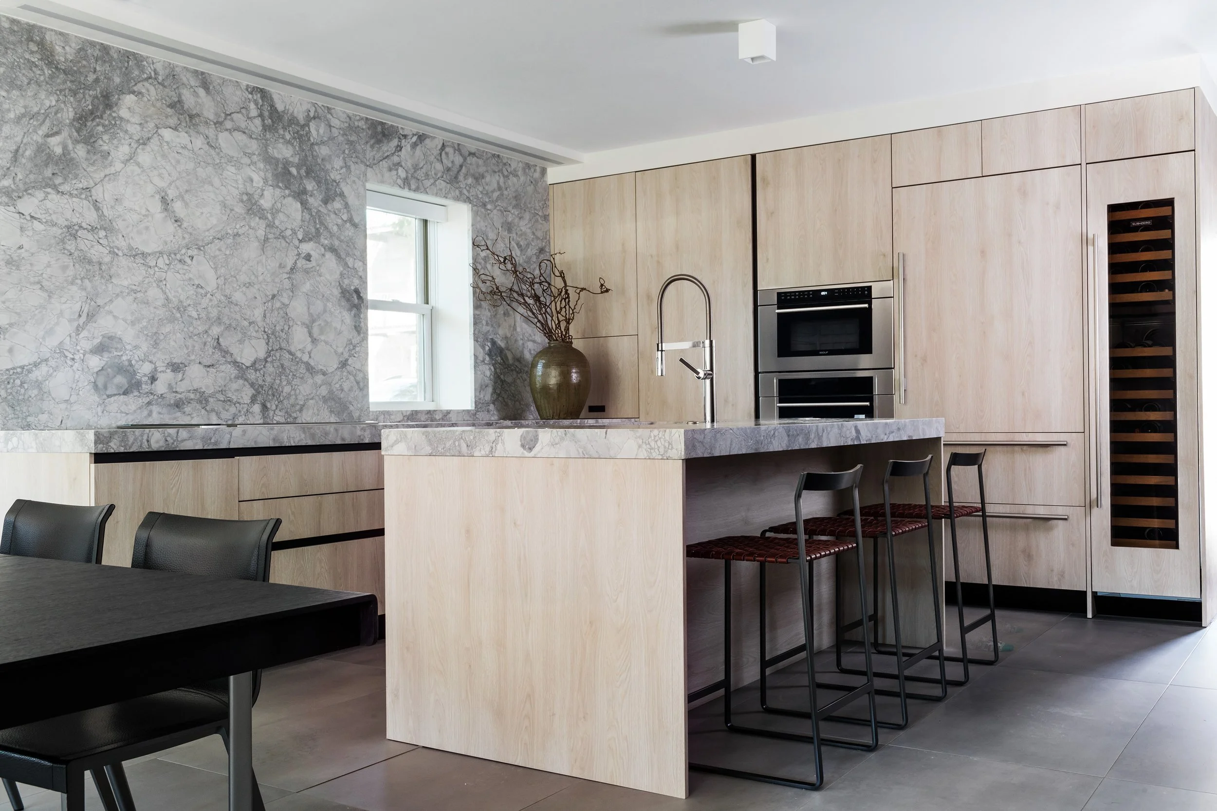 The location of the house on the waterfront provided the designer with a lot of inspiration. She decided to create a bright interior , using materials that are pleasing to the eye and visually interesting at the same time. On the ground floor, she used white quartzite on the walls , which reflects the water outside the window and creates a somewhat dreamlike atmosphere. She contrasted the cold stone with kitchen fronts made of light, warm wood, thus obtaining a seaside atmosphere.