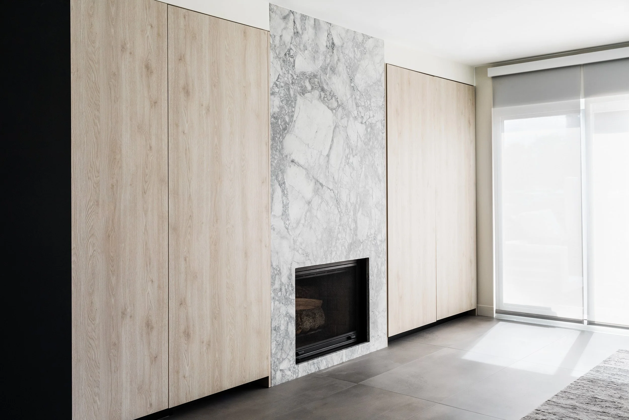 There are plenty of storage spaces throughout the house , which is especially useful for a family with children. For example, the bar and TV are hidden on either side of the fireplace in the living room. There are no upper cabinets in the kitchen, however, additional storage spaces are located in the kitchen island and under the stairs.