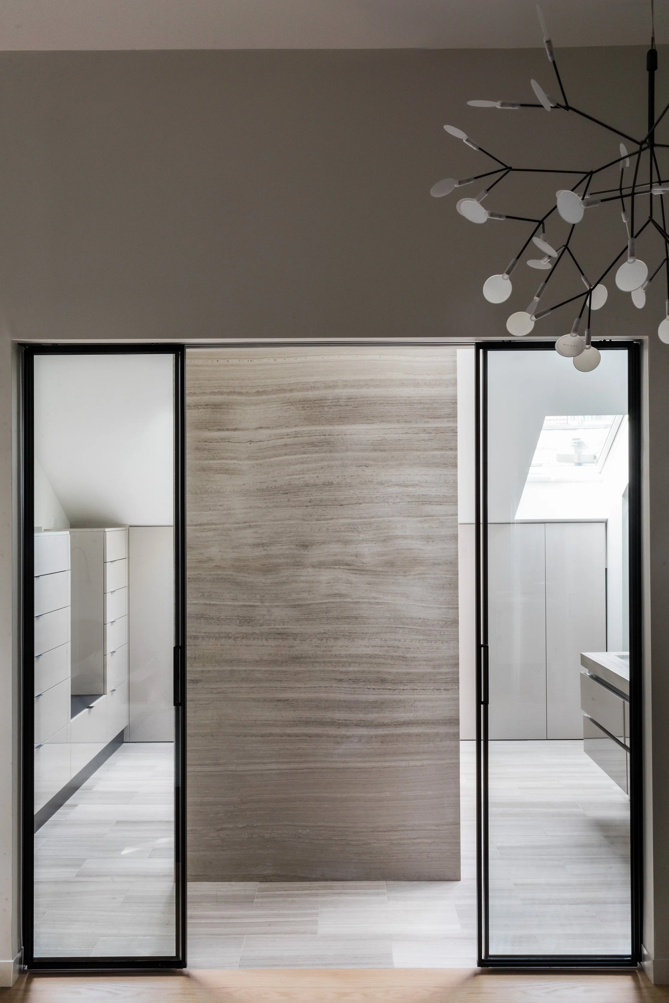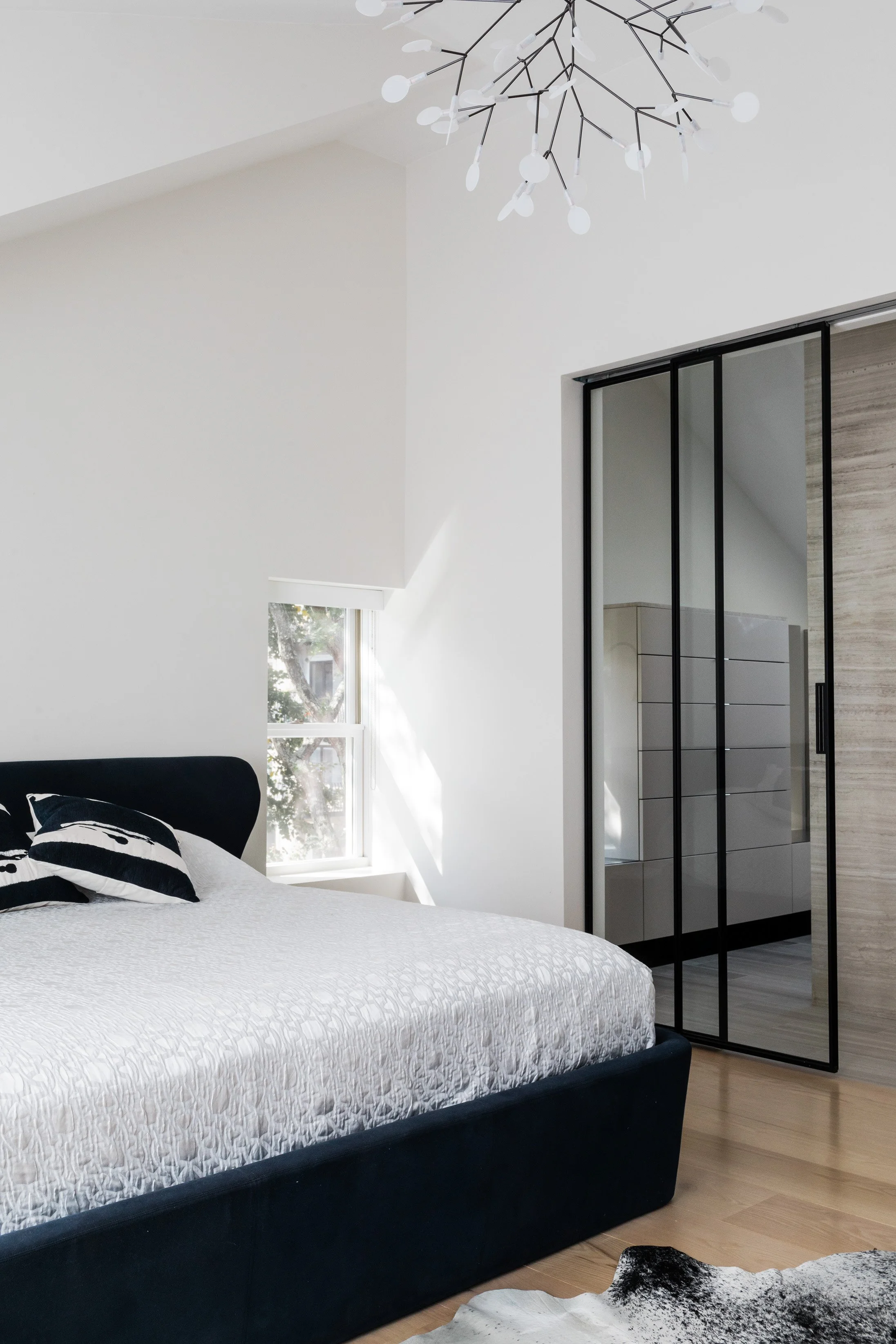 On the first floor, lacquered cupboards and wardrobes are the heart of the space . They are a counterbalance to oak, matte floors, while adding incredible lightness to the interior. Sashya Thind, instead of the classic bedroom door, used a glass door , as a result of which more light enters the rooms.