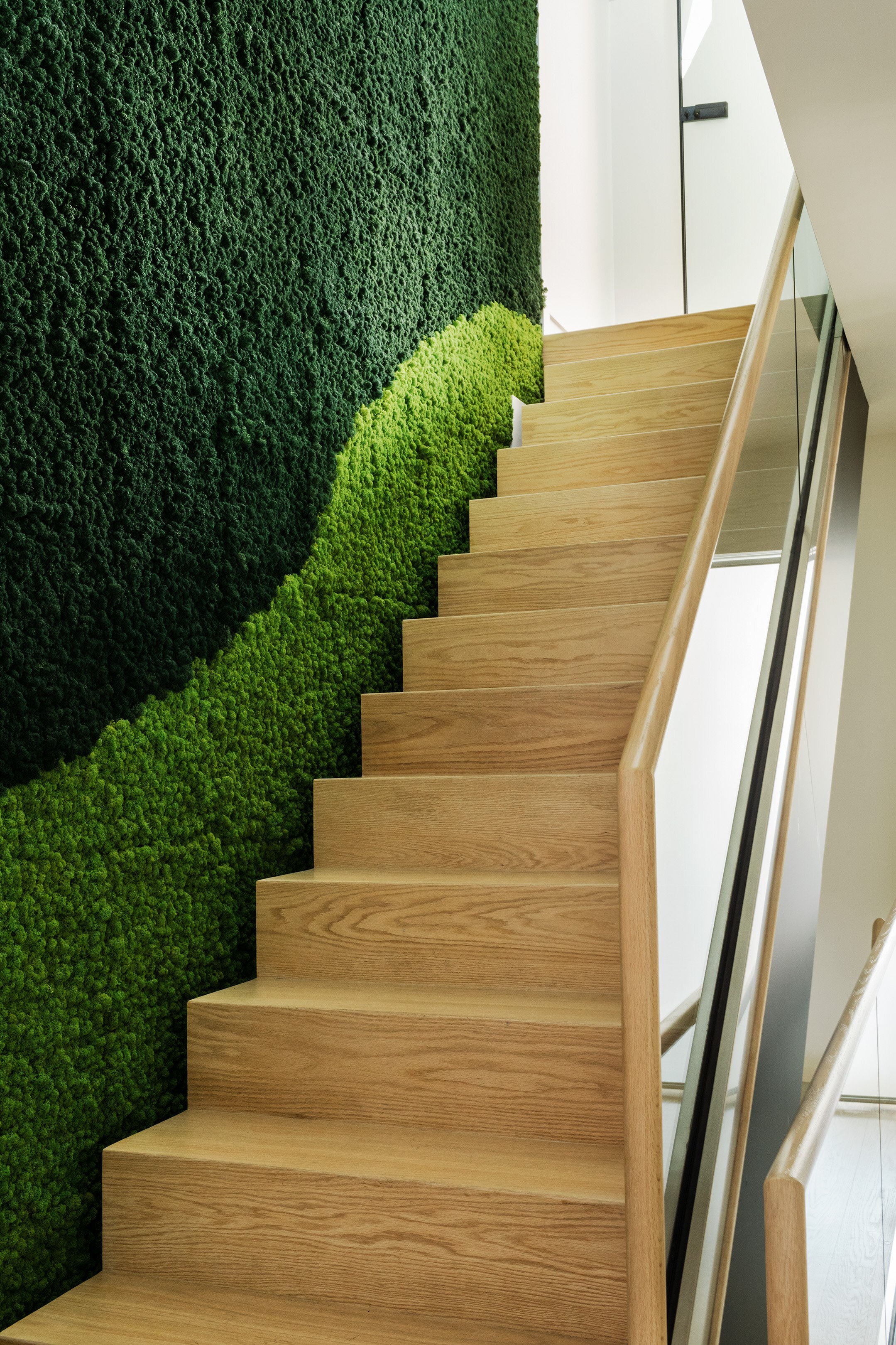 On the wall of the staircase there is a green moss that is a substitute for a forest. It fits perfectly with oak stairs and a simple balustrade made of glass and wood.