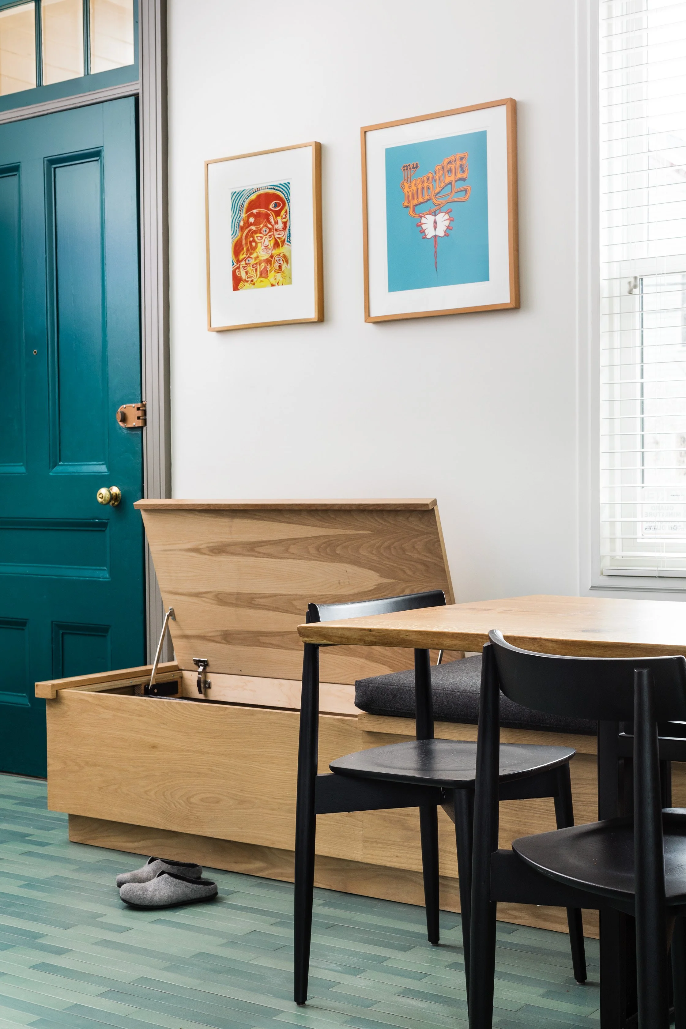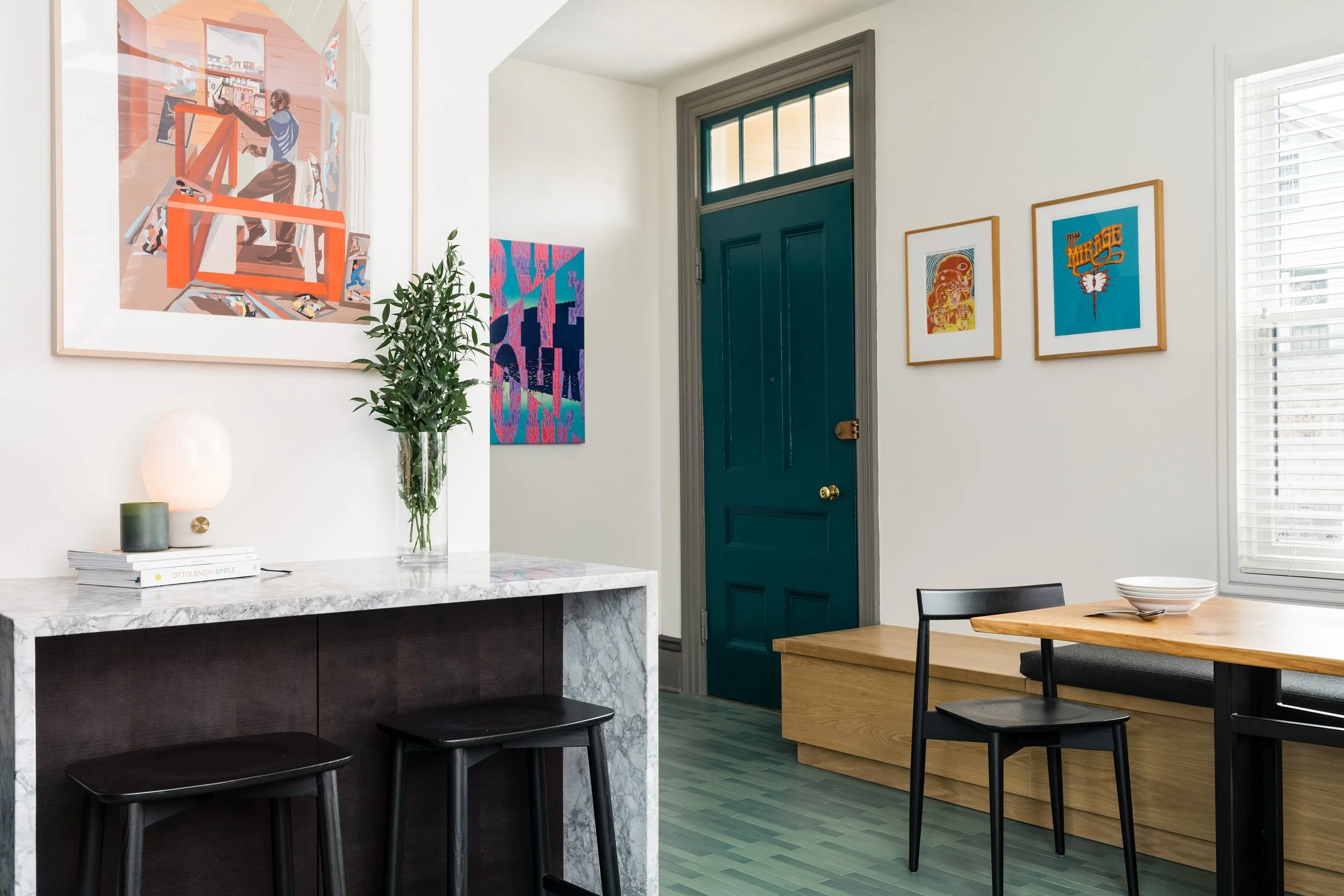 AFTER: The homeowners’ art collection adorns every nook of this kitchen-dining room furnished with Menu lighting and Ercol furniture.