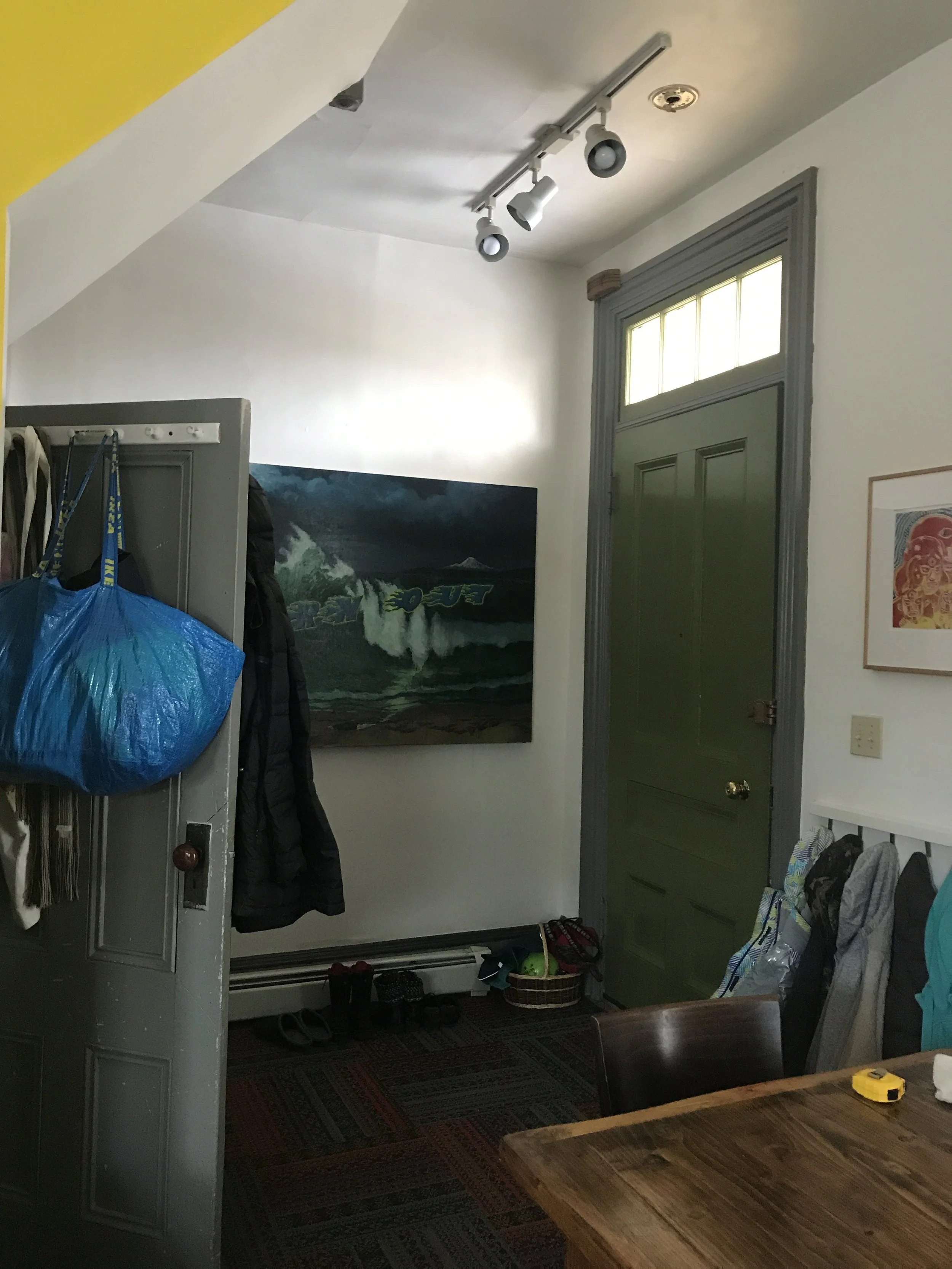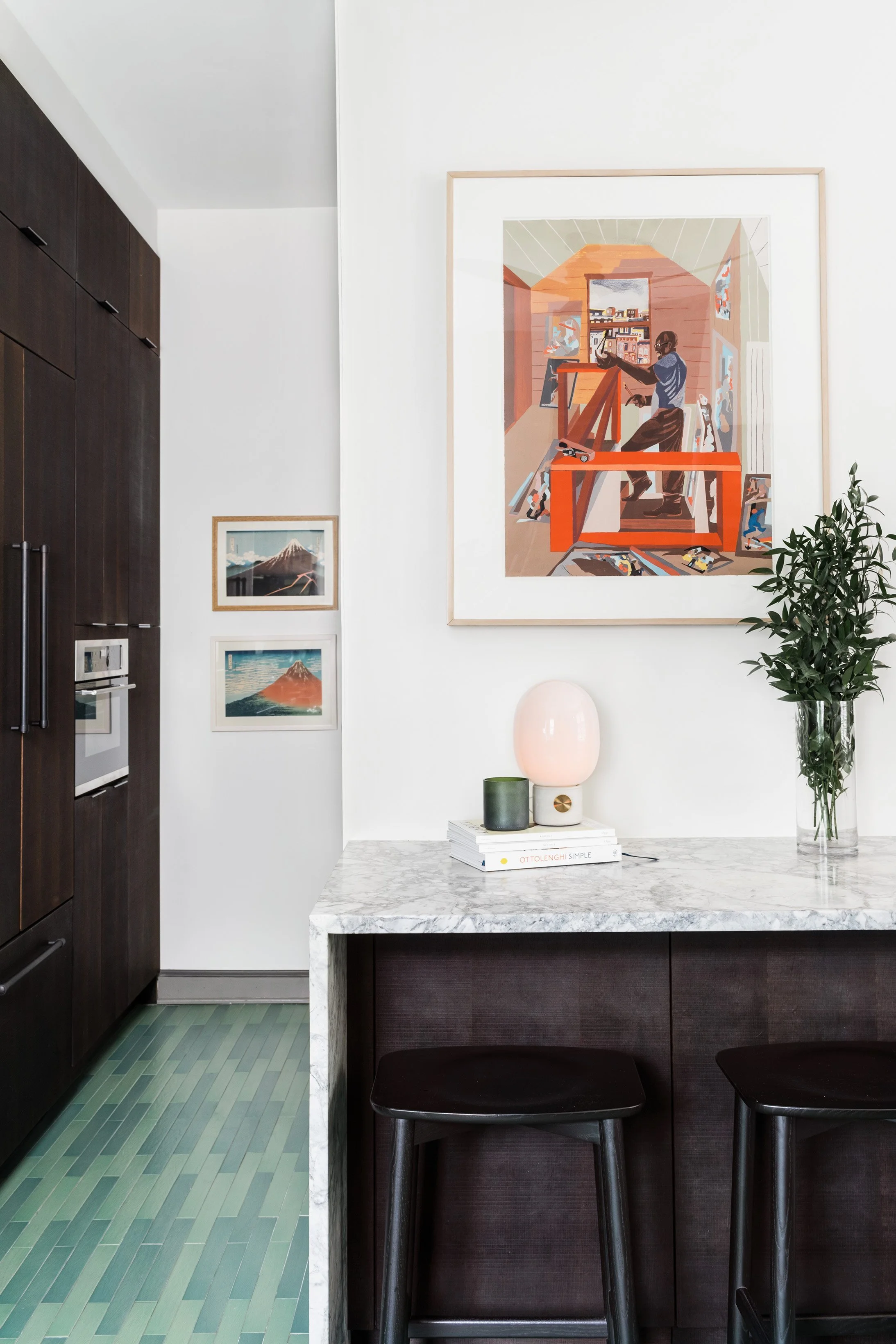 AFTER: The very compelling painting Burn Out by the client, Joe Wardwell, was the jumping-off point for the green Sashya introduced in the floors. This color ties the rest of the house together as the couple had previously renovated the bathrooms on the upper floors with a green tone. “It sets it apart and is closely connected to the clients’ art collection,” Sashya adds.