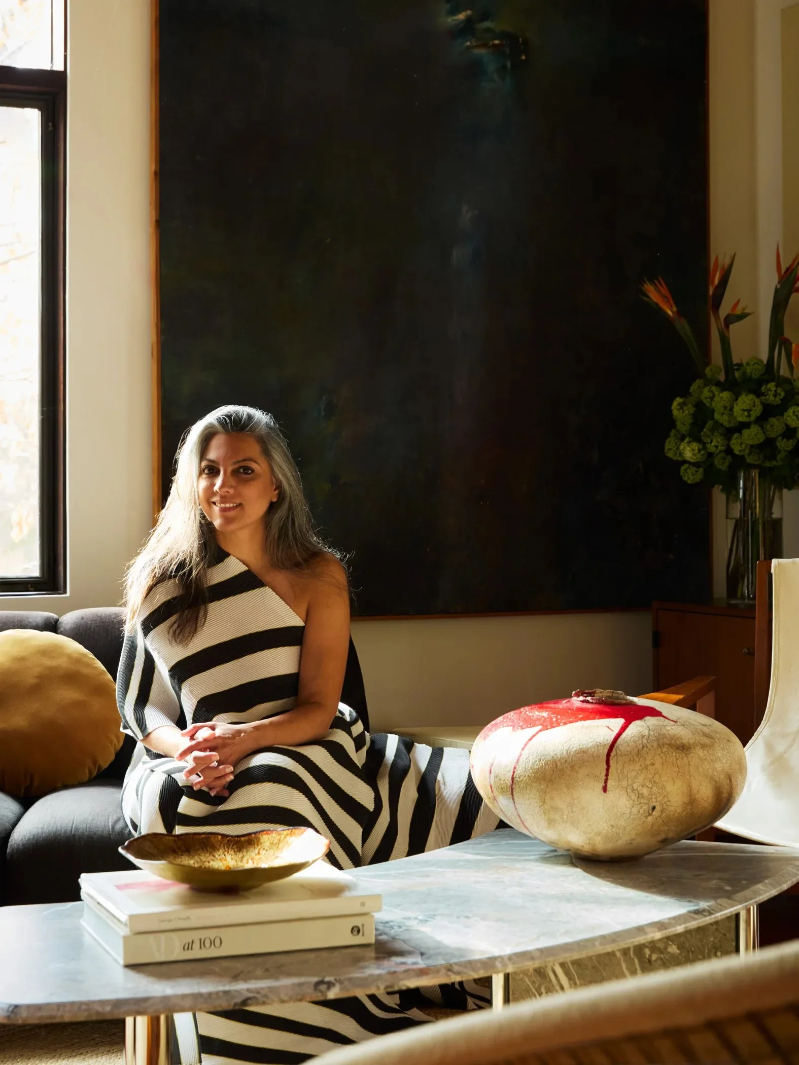 Designer Sashya Thind sits in her living room.