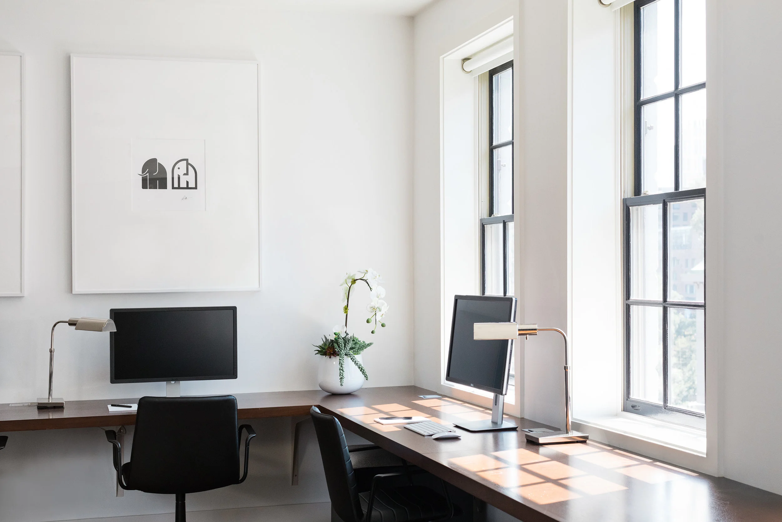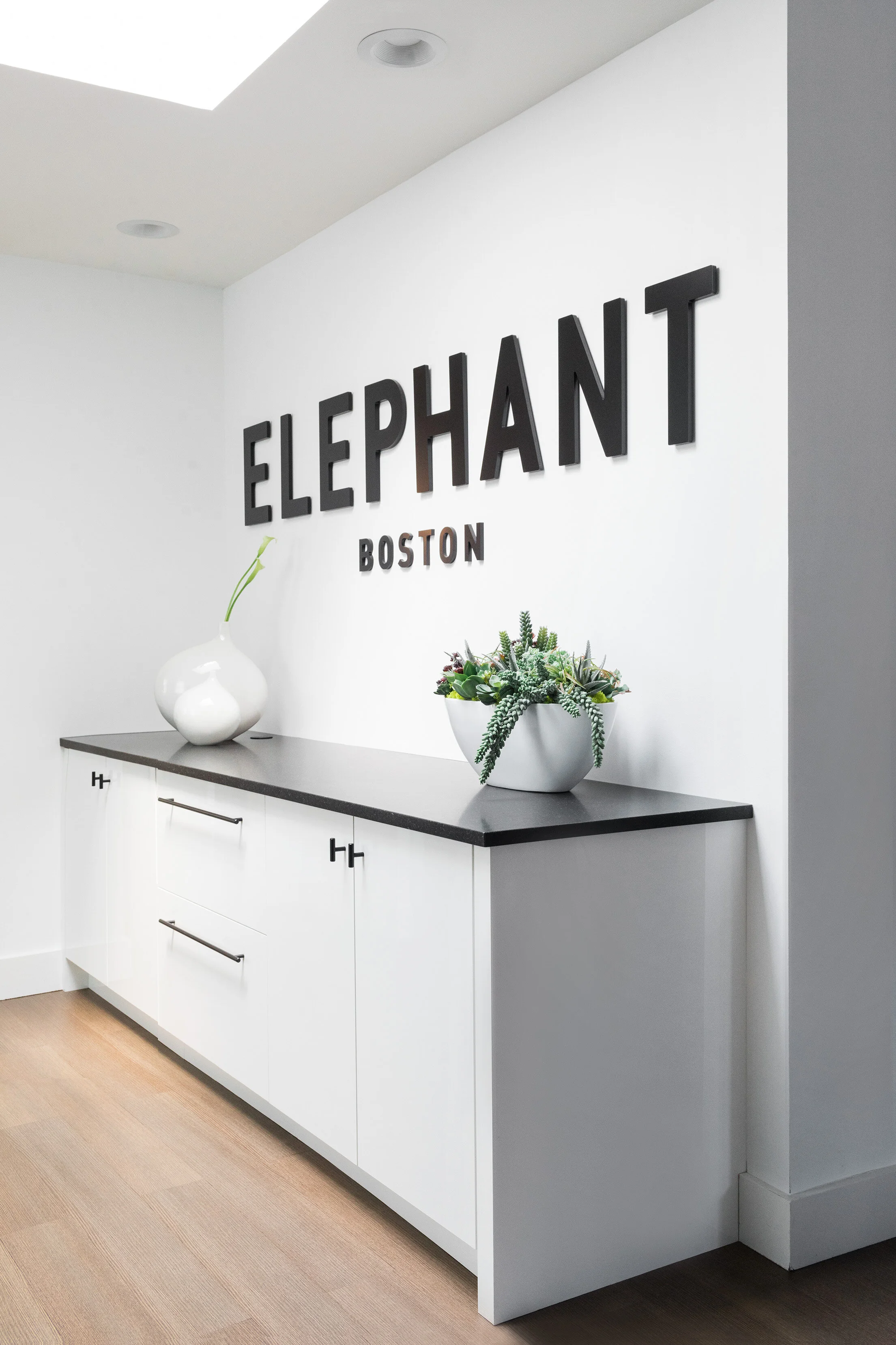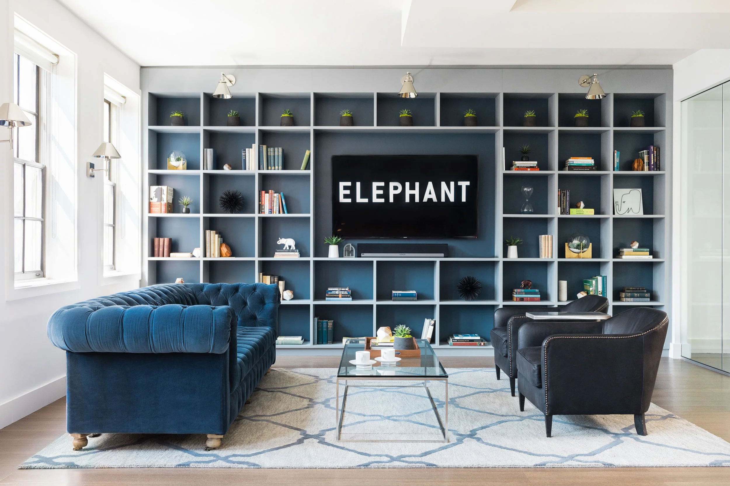 We worked with the Elephant's founder Jeremiah Daly to create an office that was reflective of his vision. He expressed the need for the office to feel like a living room while meeting the requirements of an office. We listened and created a concept where "Beacon Hill meets Newbury Street." The outcome is a bright airy space with rich tones in the upholstery and walnut wood. We integrate the contemporary branding into all aspects of the design thus allowing a seamless aesthetic.