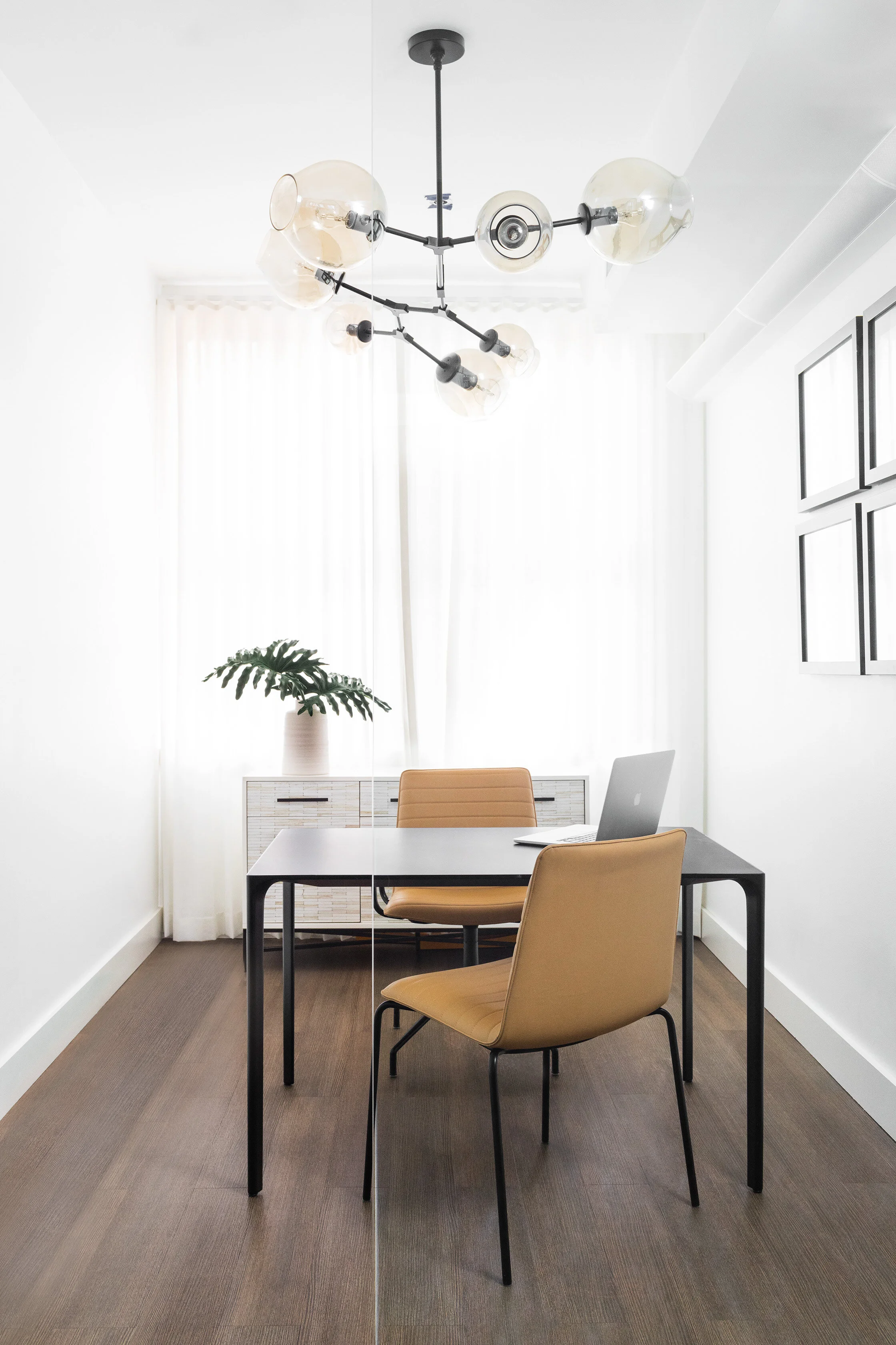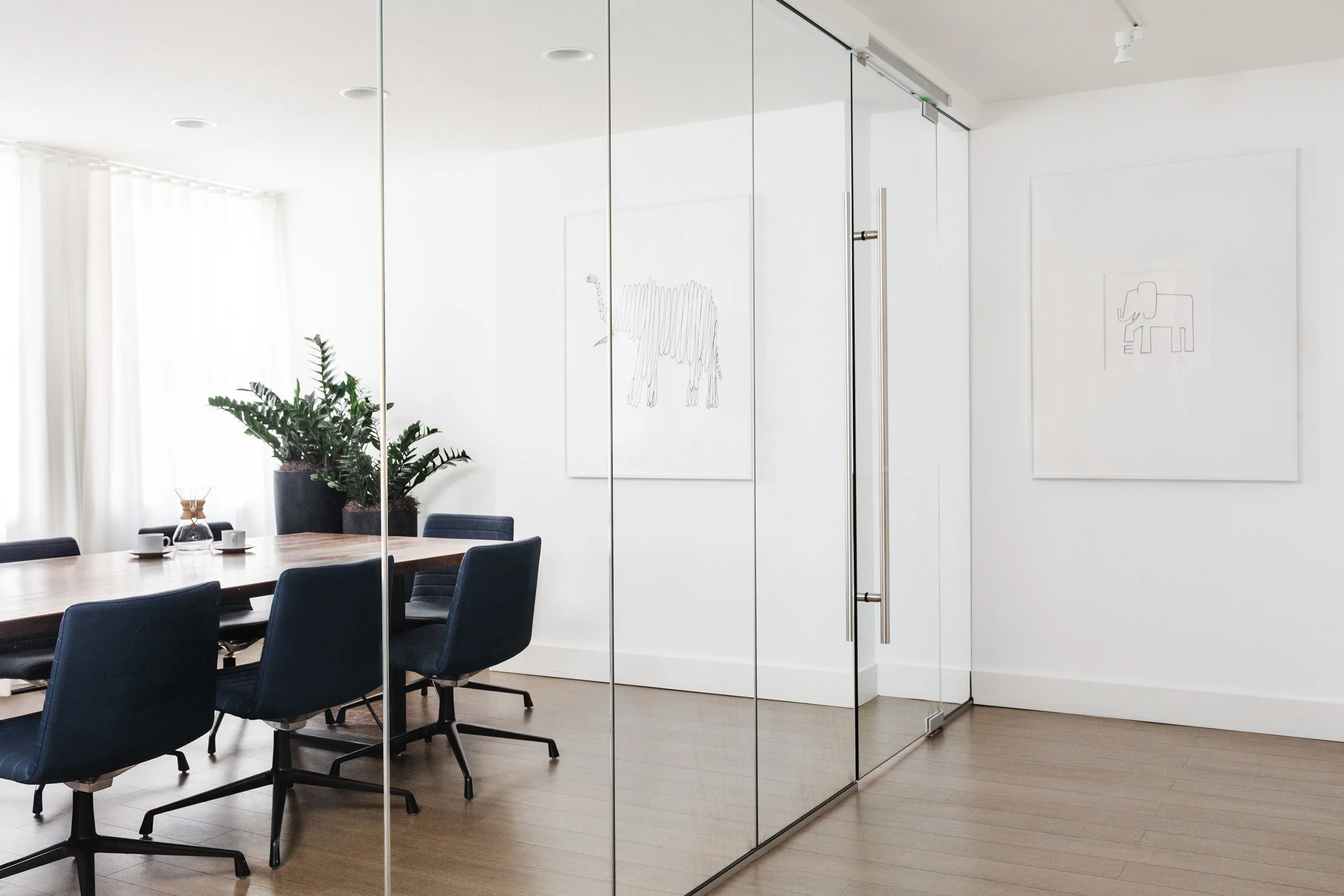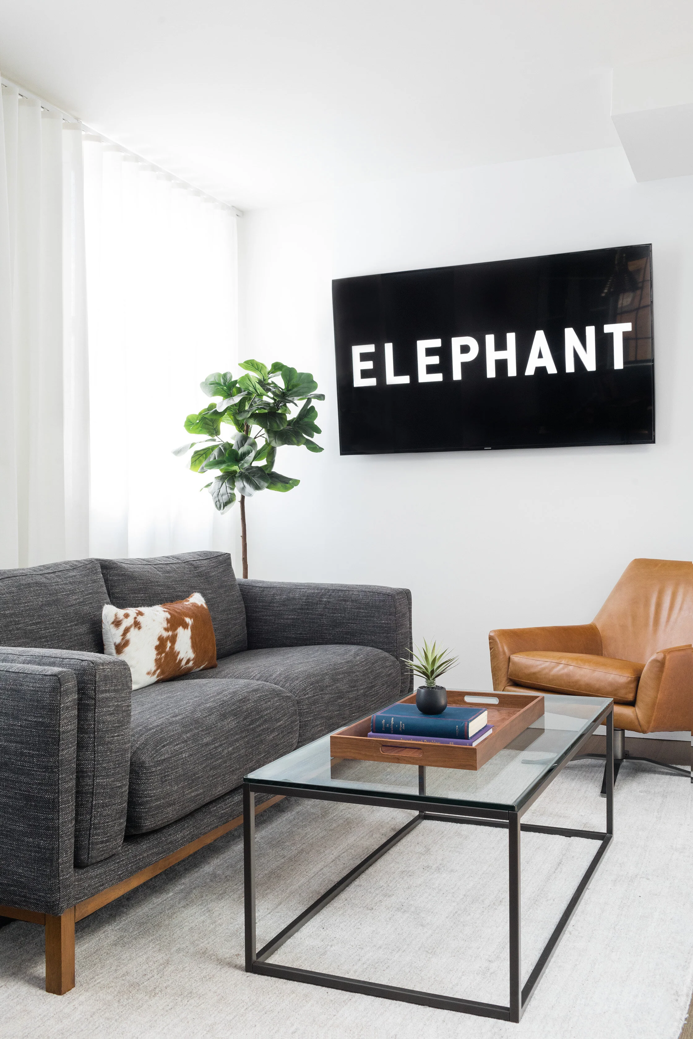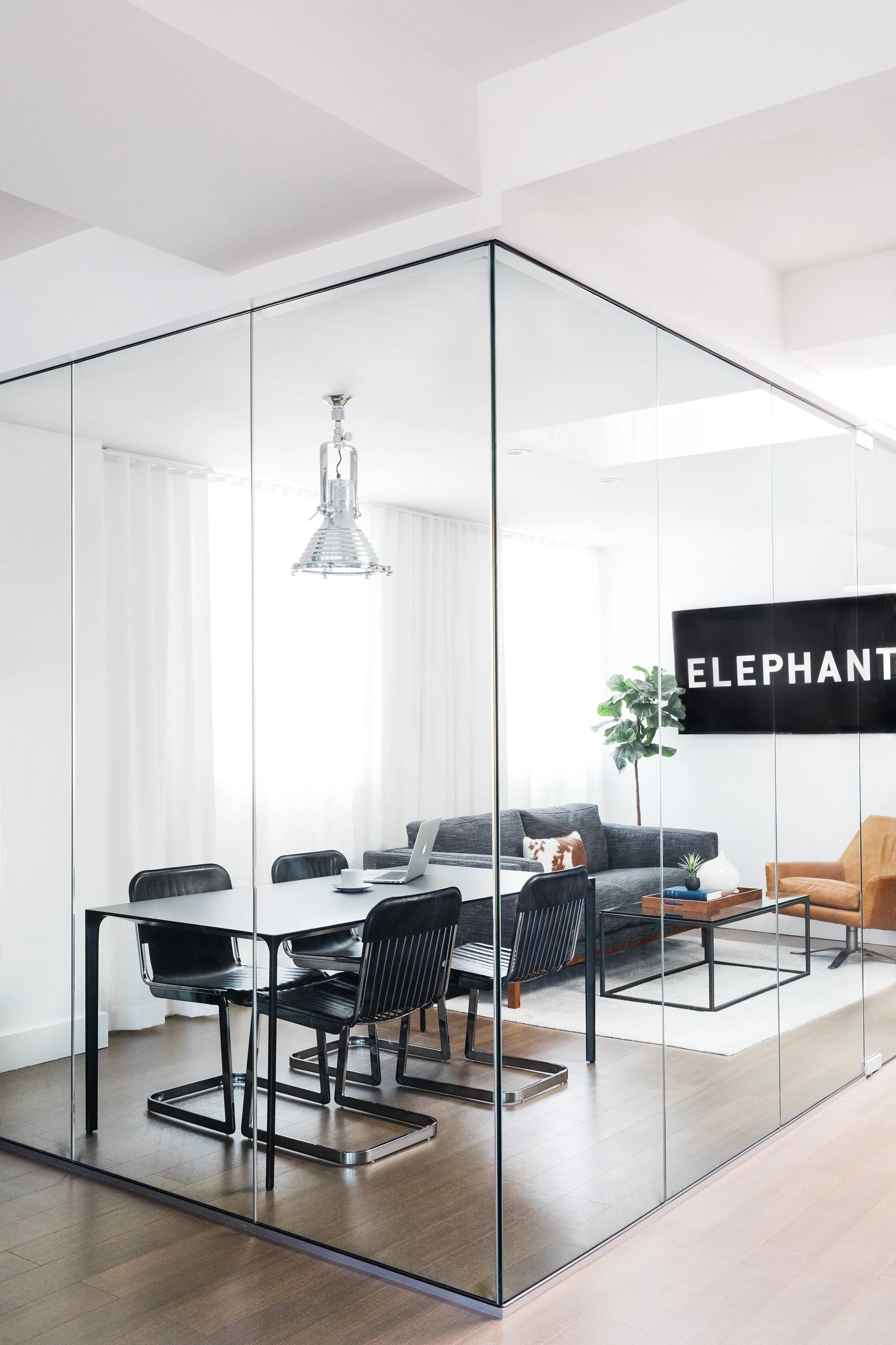 We worked with the Elephant's founder Jeremiah Daly to create an office that was reflective of his vision. He expressed the need for the office to feel like a living room while meeting the requirements of an office. We listened and created a concept where "Beacon Hill meets Newbury Street." The outcome is a bright airy space with rich tones in the upholstery and walnut wood. We integrate the contemporary branding into all aspects of the design thus allowing a seamless aesthetic.