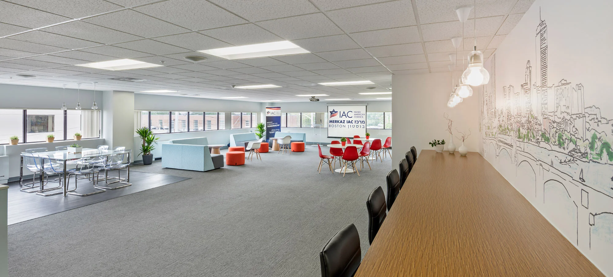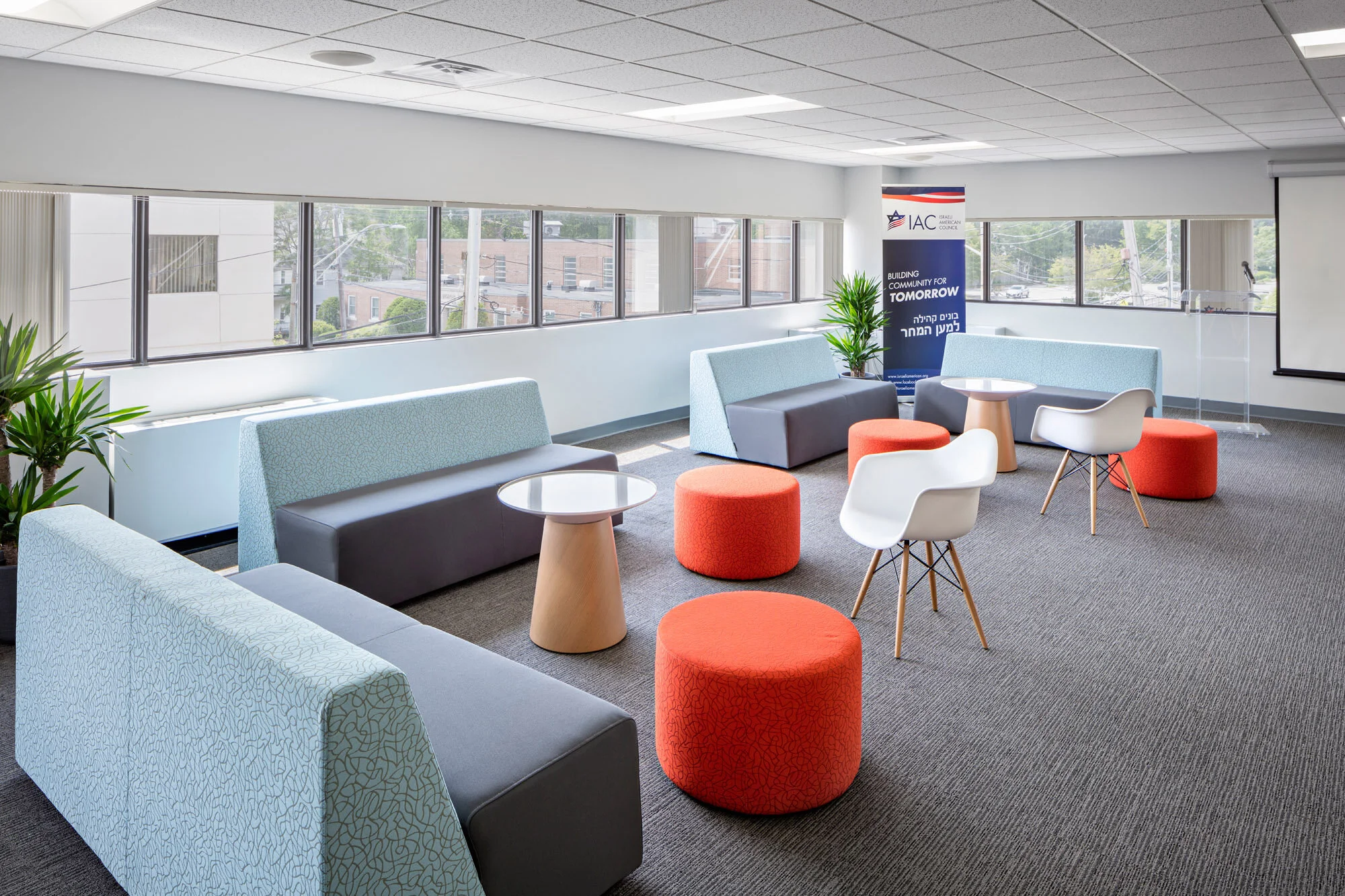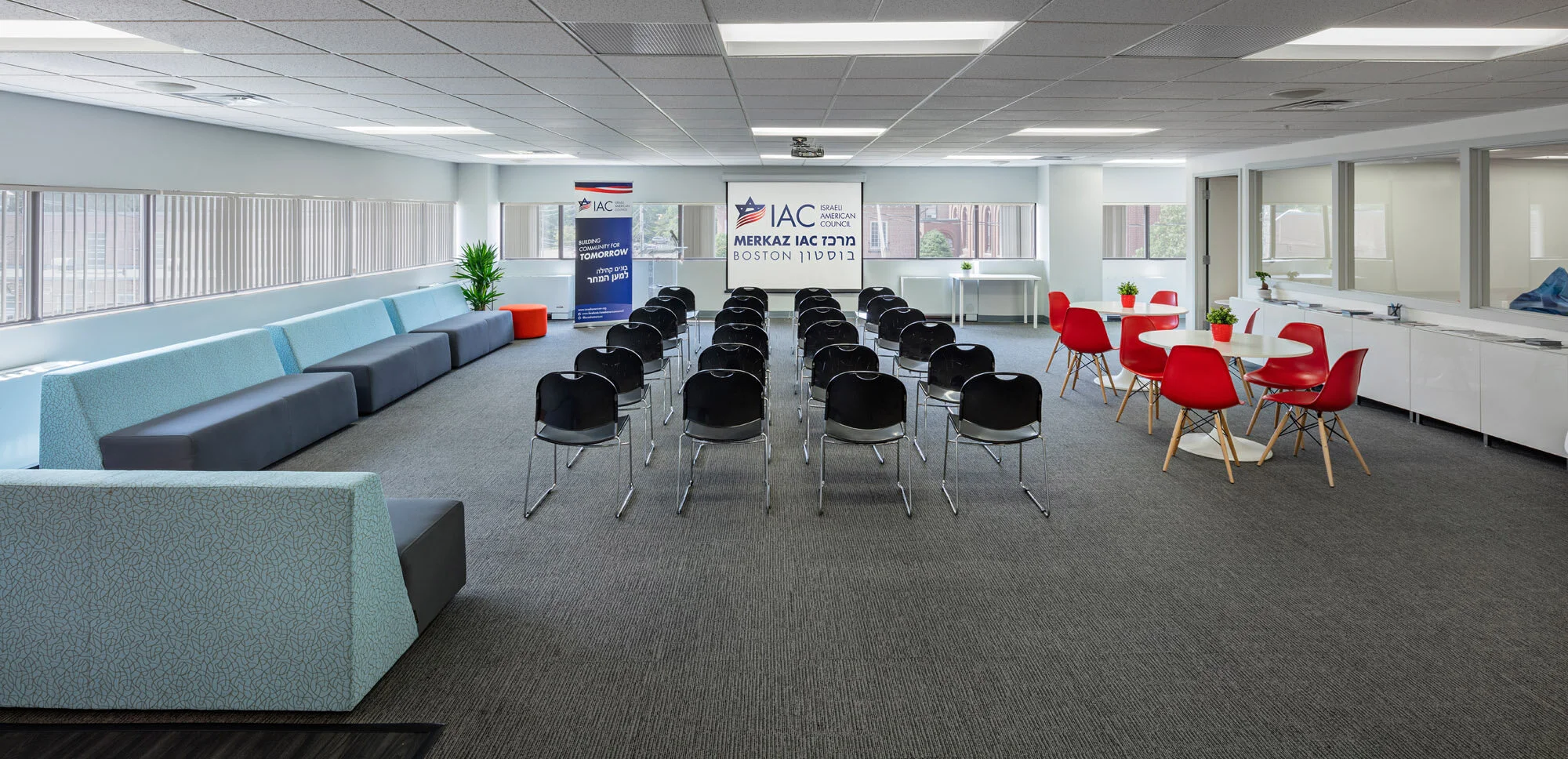 The IAC is a non-profit organization set up to support the Israeli American Community in Boston. The space is designed to accommodate large groups of people and activities. The seating is multi-functional and can be moved to add 75 chairs for seminars and meetings. The space is frequented by a varied demographic from teens, young mothers to seniors.