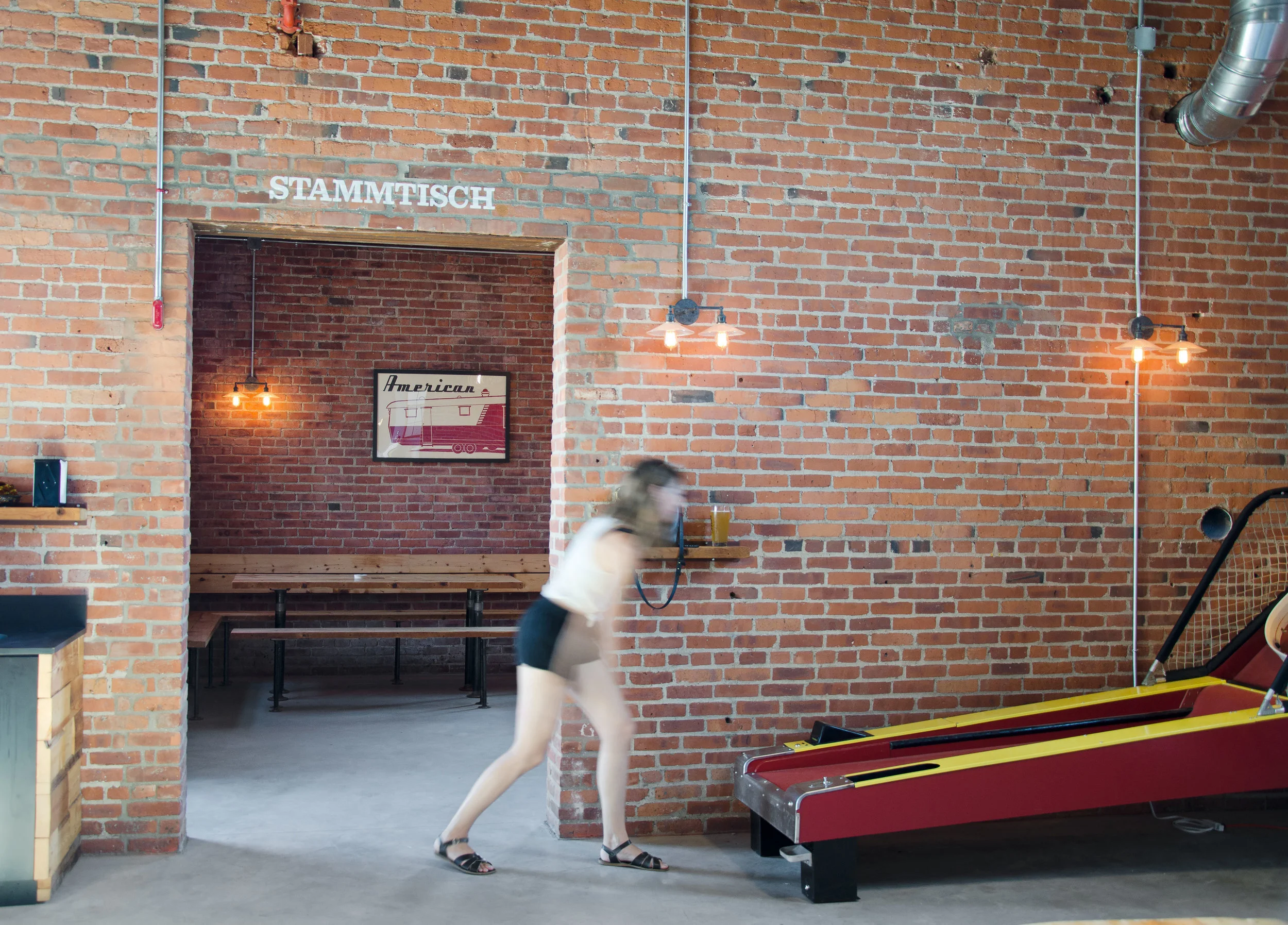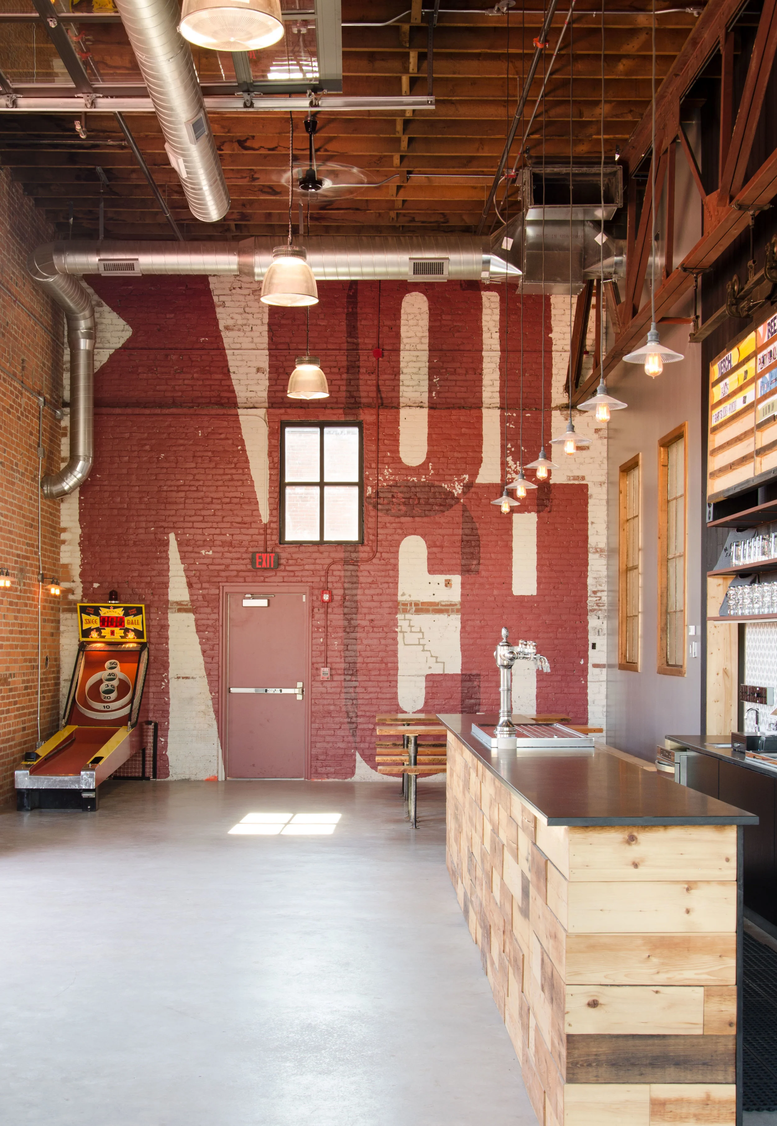 Notch brewing is designed to reflect the Sessions craft beer movement. The long benches fabricated from the wood reclaimed in the space, create a feeling of community while you enjoy some 80s alternative rock music. The graphic hand painted walls are reminiscent of Americana and ties back to the branding and packaging of Notch. The brick walls, concrete floors and the presence of wood are all elements associated with the raw beauty of an industrial palette which the owner Chris Lohring was very keen on maintaining.